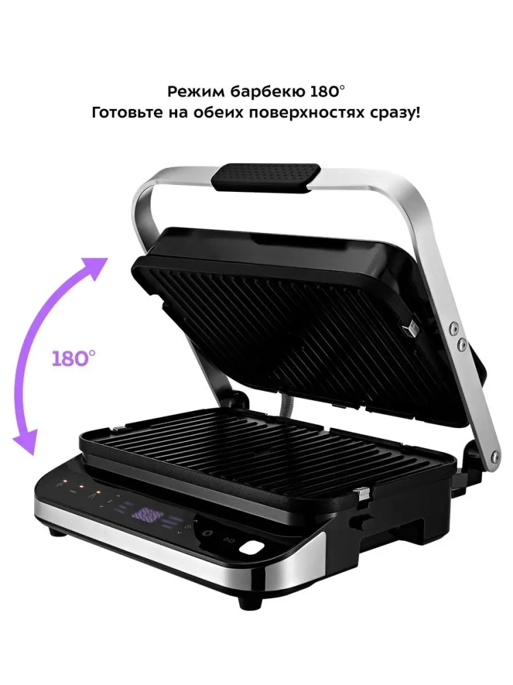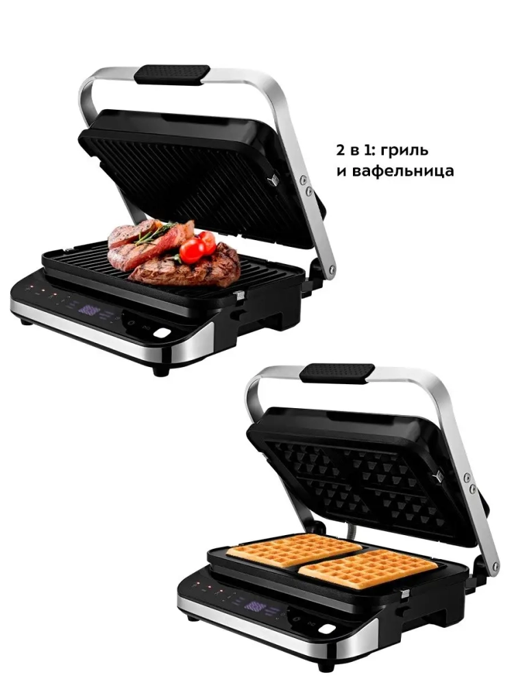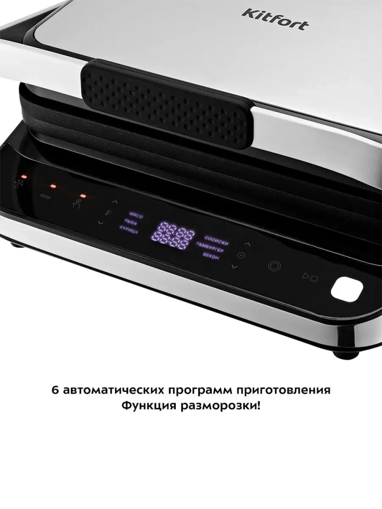 Электрогриль оснащен термостатом для поддержания постоянной температуры панелей, а также панелью управления. Панель управления позволяет выбрать режим работы устройства, также на ней отображается информация о работе прибора.