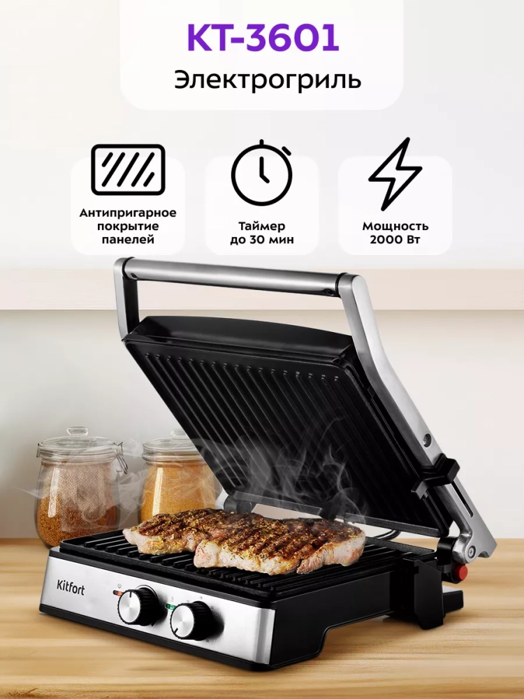 Электрогриль КТ-3601 двусторонний гриль электрический 2000Вт