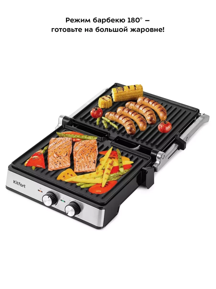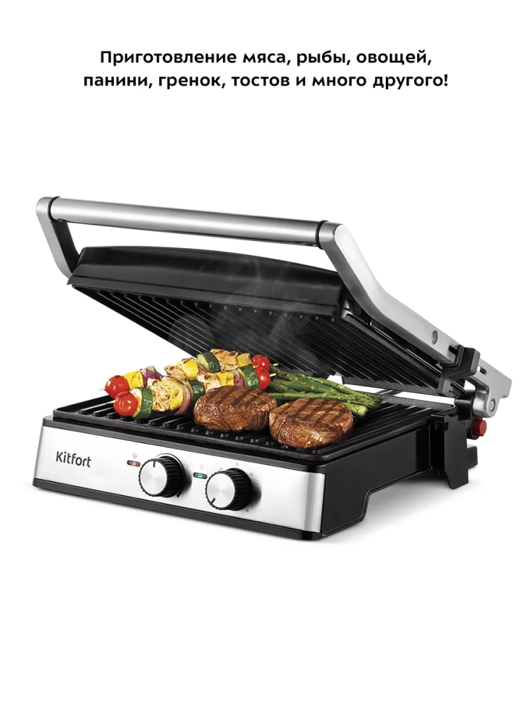 Электрогриль Kitfort КТ-3601 предназначен для приготовления мяса, рыбы, овощей, сосисок, бутербродов, панини, сэндвичей, гренок, тостов и многих других блюд.