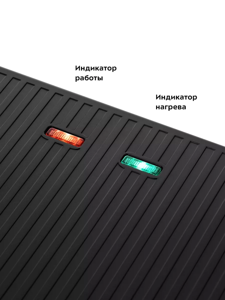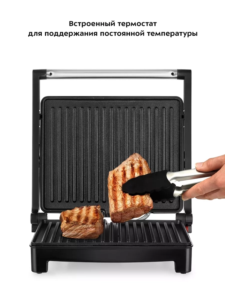 Гриль оснащен термостатом для поддержания температуры панелей, а также индикаторами работы и нагрева. Прорезиненные ножки не дают прибору скользить по столу во время готовки.