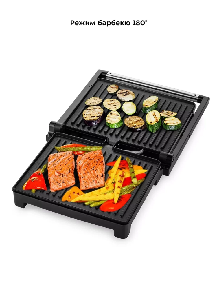 Конструкция гриля позволяет готовить в двух режимах: двустороннем и одностороннем. В двустороннем режиме электрогриль закрывается крышкой, так что продукты находятся между двух нагреваемых панелей и готовятся с двух сторон сразу. Такой способ позволяет сократить время готовки, а также не требует переворачивания продуктов во время приготовления. В одностороннем режиме крышка гриля откидывается на 180°, благодаря чему гриль превращается в большую жаровню, а продукты можно выложить сразу на две панели.