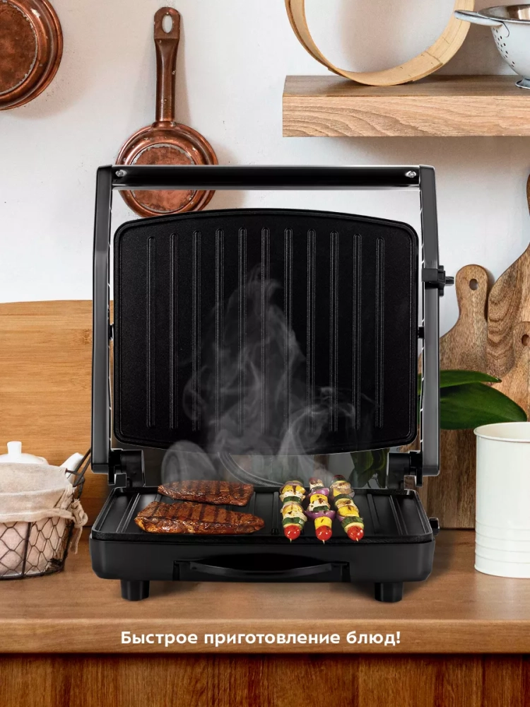 Гриль оснащен термостатом для поддержания температуры панелей, а также индикаторами работы и нагрева. С помощью регулятора вы сможете плавно менять температуру приготовления в пределах от 130 до 190 °С. Прорезиненные ножки не дают прибору скользить по столу во время готовки. Специальный фиксатор сбоку гриля удерживает крышку в закрытом состоянии, что делает готовку, транспортировку и хранение более удобными.