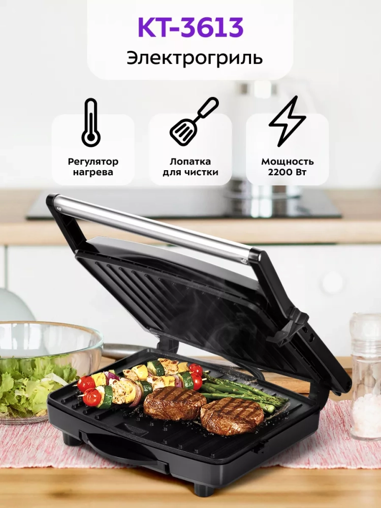 Электрогриль КТ-3613 двусторонний гриль электрический 2200Вт