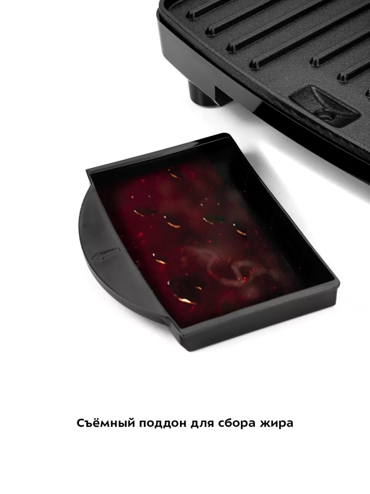 Конструкция электрогриля предусматривает приготовление продуктов с закрытой крышкой. При таком приготовлении блюд продукты находятся между двух нагреваемых панелей и готовятся с двух сторон. Приготовление блюд с закрытой крышкой позволяет им быстрее готовиться и не требует от вас переворачивать еду в процессе приготовления. Данная модель оснащена поддоном для слива жира и сока, которые выделяются в процессе приготовления продуктов.