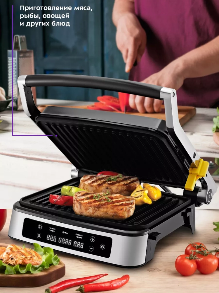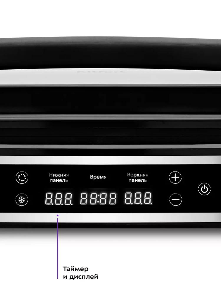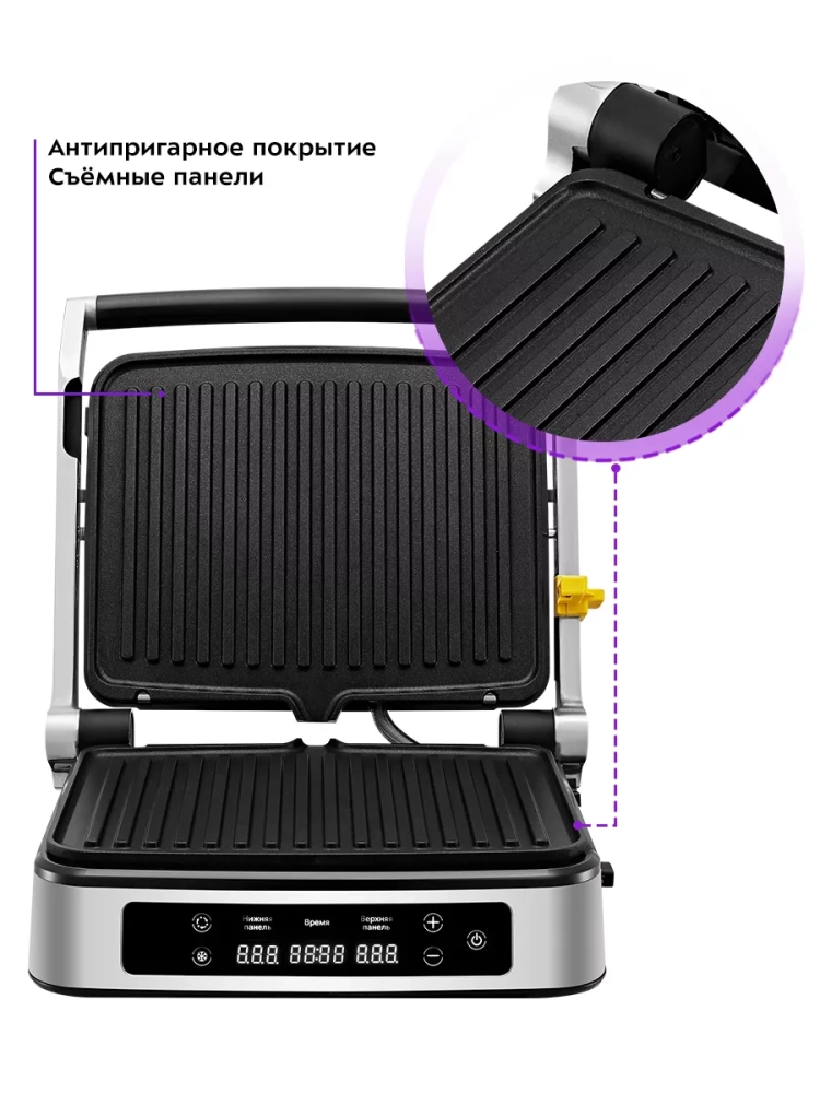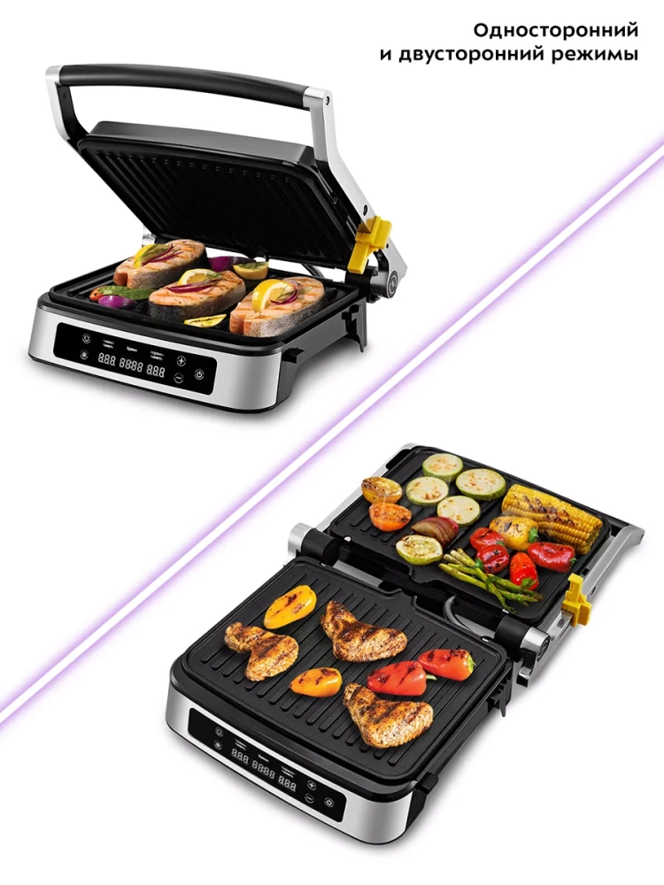 Электрогриль оснащен термостатом для поддержания постоянной температуры нагреваемых панелей, а также панелью управления. Вы можете выбрать нагреваемую панель и настроить нужную температуру и время таймера. Температура нагрева каждой панели настраивается отдельно, поэтому есть возможность настроить разную температуру нагрева панелей или включить нагрев только нижней панели. На дисплеях отображаются температура и время таймера.