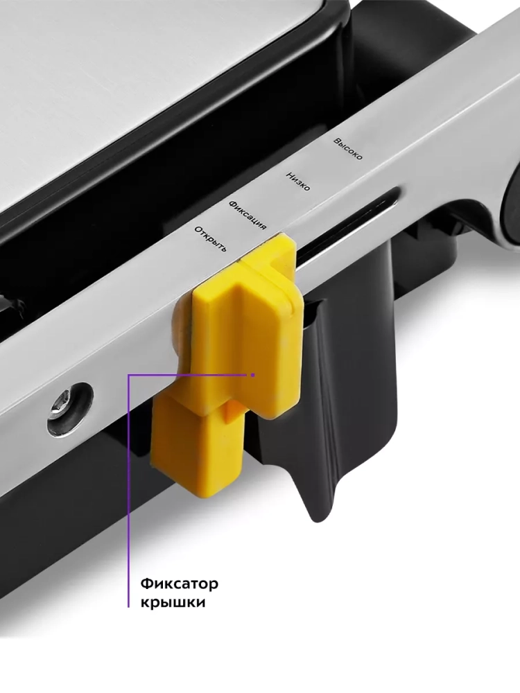Ручка гриля не нагревается во время работы, а прорезиненные ножки не дают прибору скользить по столу. Крышку гриля можно зафиксировать в закрытом положении. Также можно готовить продукты с приоткрытой крышкой: для этого ее также можно зафиксировать в 2 положениях для продуктов разной толщины. Это удобно для мягких продуктов, если вы не хотите придавливать их.