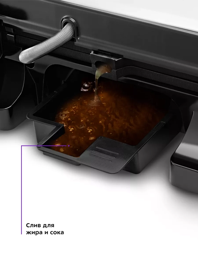 Для сбора жира, соков и прочих жидкостей предназначен специальный съемный поддон — во время приготовления излишки жидкости стекают в него.