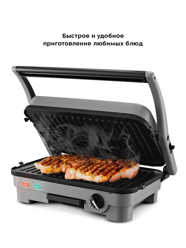 Гриль оснащен термостатом для поддержания температуры панелей, а также индикаторами питания и нагрева. С помощью регулятора температуры вы сможете плавно менять температуру приготовления.