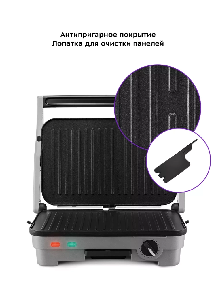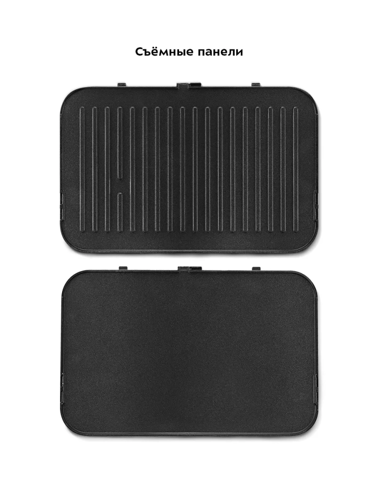 Панели у прибора съемные. Обе панели с одной стороны имеют ребристую поверхность, с другой стороны — гладкую поверхность. Это позволит вам готовить продукты с характерным для гриля узором и без. Также это делает прибор более универсальным, так как для разных типов продуктов подходит разный тип поверхности.