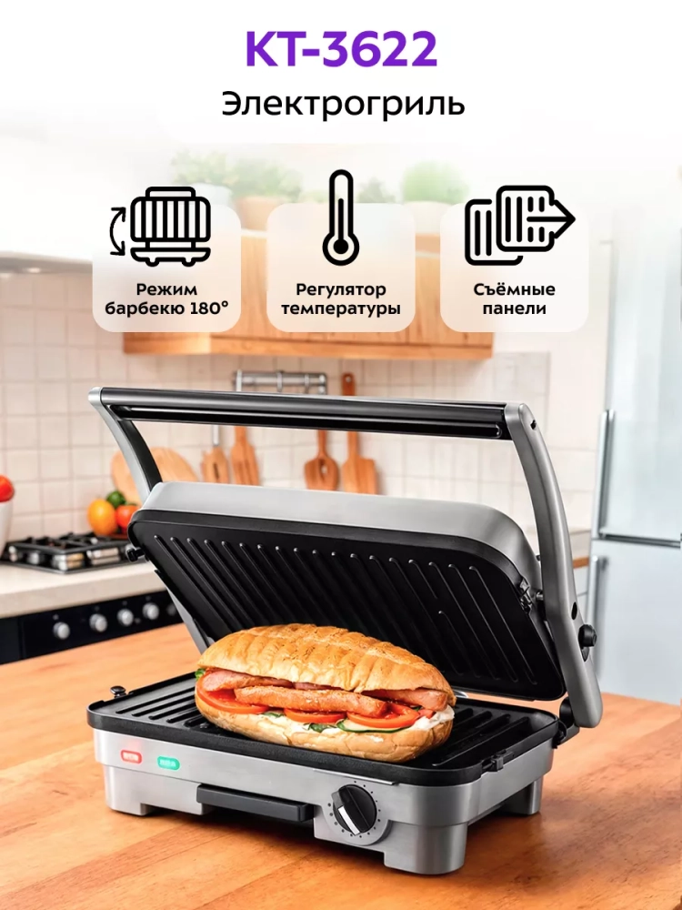 Электрогриль КТ-3622 двусторонний гриль электрический 1800Вт