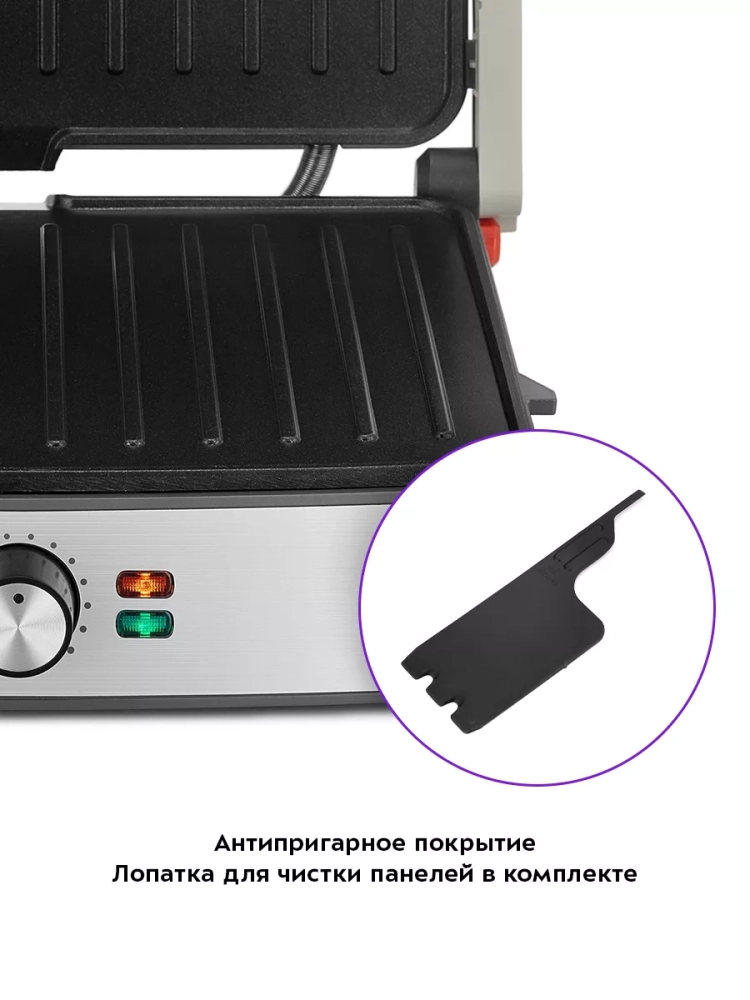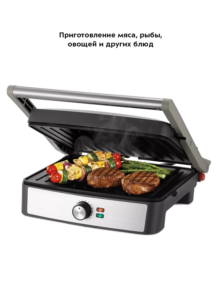 Гриль оснащен термостатом для поддержания температуры панелей, а также индикаторами питания и нагрева. С помощью регулятора температуры вы сможете плавно менять температуру приготовления.