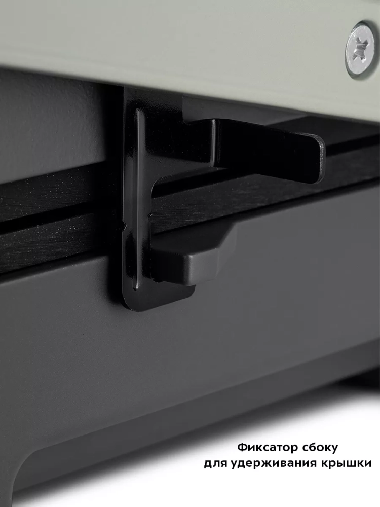 Специальный фиксатор сбоку гриля удерживает крышку в закрытом положении, что делает готовку, транспортировку и хранение более удобными.