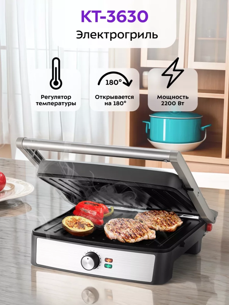 Электрогриль КТ-3630 двусторонний гриль электрический 2200Вт