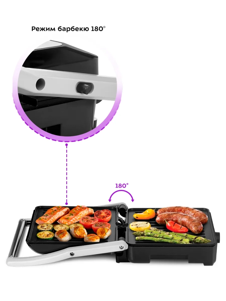 Конструкция гриля позволяет готовить в двух режимах: двустороннем и одностороннем. В двустороннем режиме электрогриль закрывается крышкой, так что продукты находятся между двух нагреваемых панелей и готовятся с двух сторон сразу. Такой способ позволяет сократить время готовки, а также не требует переворачивания продуктов во время приготовления. В одностороннем режиме крышка гриля откидывается на 180°, благодаря чему гриль превращается в большую жаровню, а продукты можно выложить сразу на две панели.