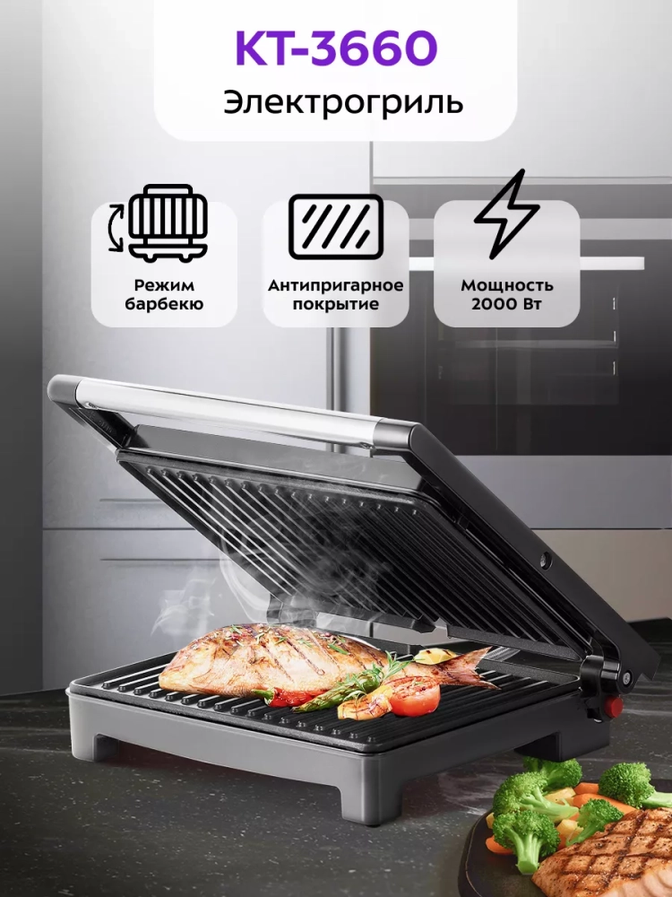 Электрогриль КТ-3660 двусторонний гриль электрический 2000Вт