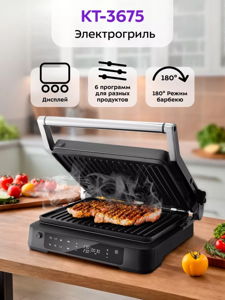 Электрогриль КТ-3675 двусторонний гриль электрический 2000Вт