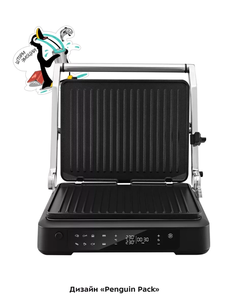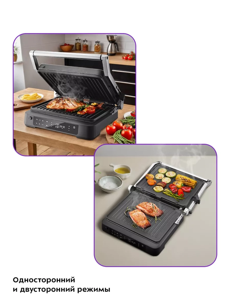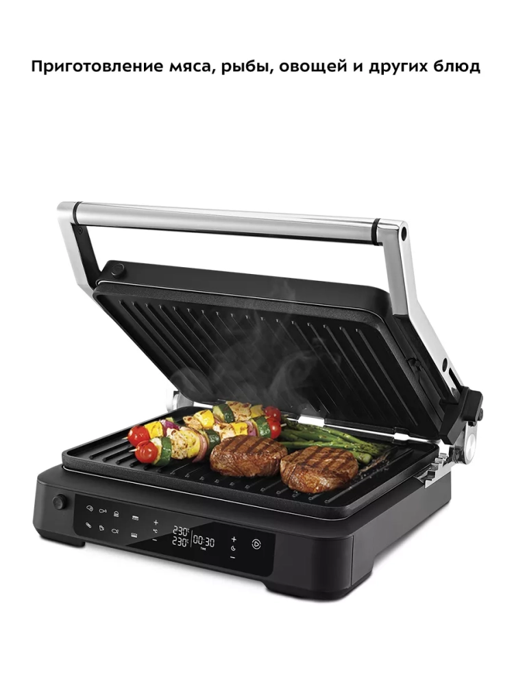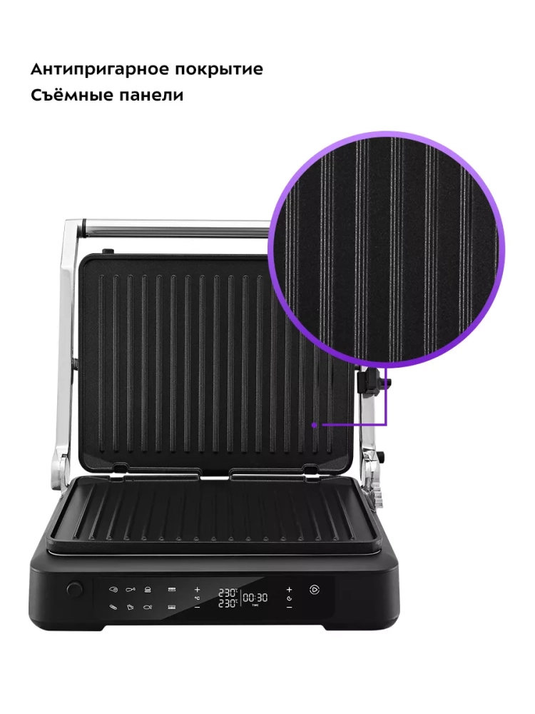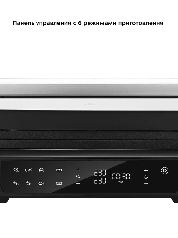 Прибор оснащен панелью управления, с помощью которой вы сможете установить желаемую температуру приготовления (для каждой панели можно установить свою температуру), время таймера, а также включить приготовление в одном из 6 предустановленных режимов.