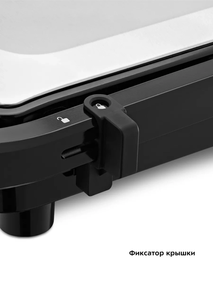 Специальный фиксатор сбоку гриля удерживает крышку в закрытом состоянии, что делает готовку, транспортировку и хранение более удобными.