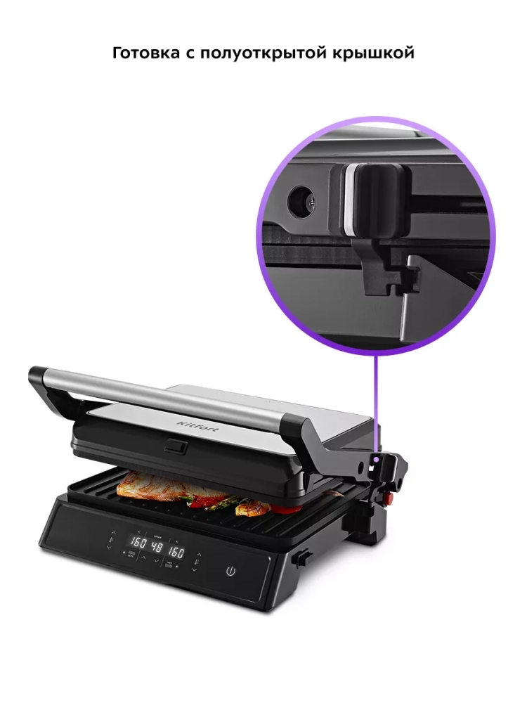 Специальный фиксатор сбоку гриля удерживает крышку в закрытом состоянии, что делает готовку, транспортировку и хранение более удобными. Он также позволяет удерживать крышку в приоткрытом положении.