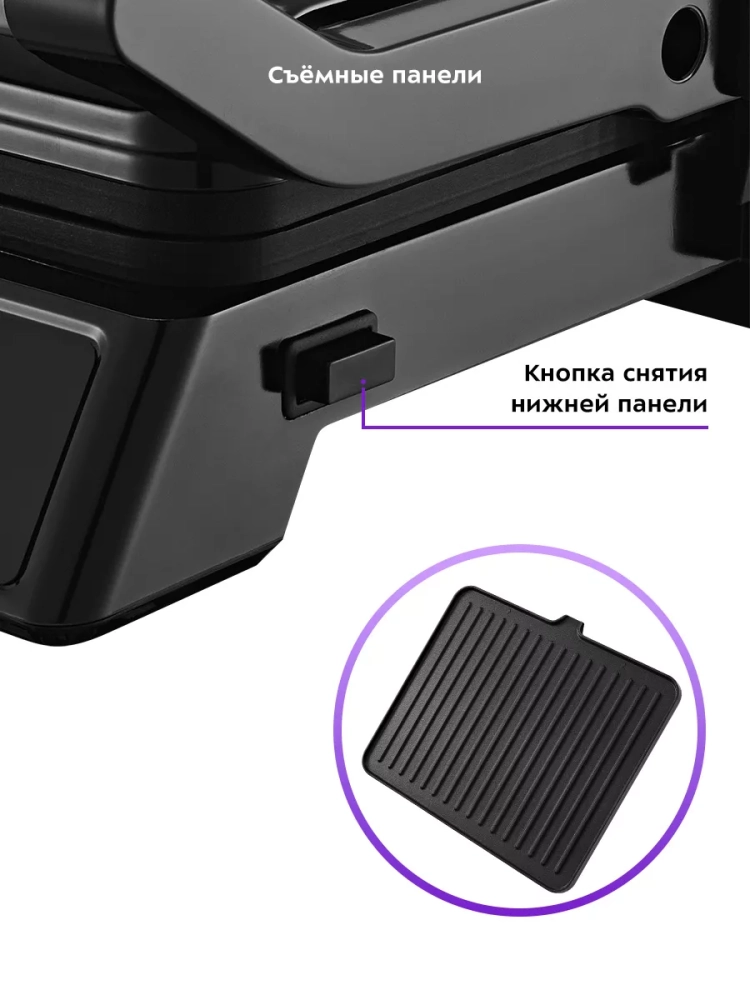 На панели нанесено антипригарное покрытие, что позволяет готовить с минимальным количеством масла или без него. Такое покрытие также облегчает процесс чистки панелей. Панели у этого гриля съемные.