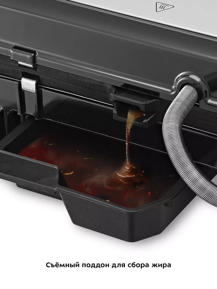 Конструкция гриля позволяет готовить в трех режимах: двустороннем, одностороннем и с приоткрытой крышкой. В двустороннем режиме гриль закрывается крышкой, благодаря чему продукты находятся между двух нагреваемых панелей и готовятся с двух сторон. В режиме приготовления с приоткрытой крышкой верхняя нагреваемая панель опускается не до конца, что полезно при готовке продуктов, которые могут потерять форму из-за давления крышки. В одностороннем режиме крышка гриля откидывается на 180°, благодаря чему гриль превращается в большую жаровню, а продукты можно выложить сразу на две панели. Данная модель оснащена поддоном для слива жира и сока, которые выделяются в процессе приготовления продуктов.