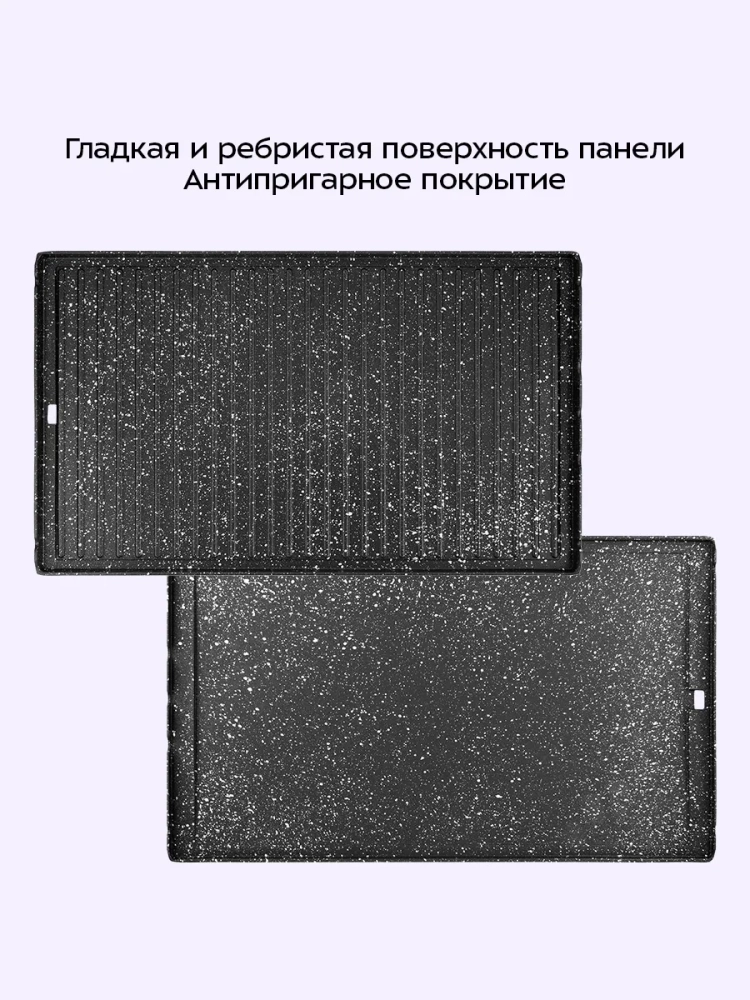 Электрогриль-шашлычница оснащен двухсторонней панелью гриля: поверхность с одной стороны ребристая, с другой — гладкая. Для удобства очистки панель сделана съемной. На обе стороны нанесено антипригарное покрытие, что позволяет готовить на электрогриле-шашлычнице с минимальным количеством масла. Такое покрытие также облегчает процесс чистки.