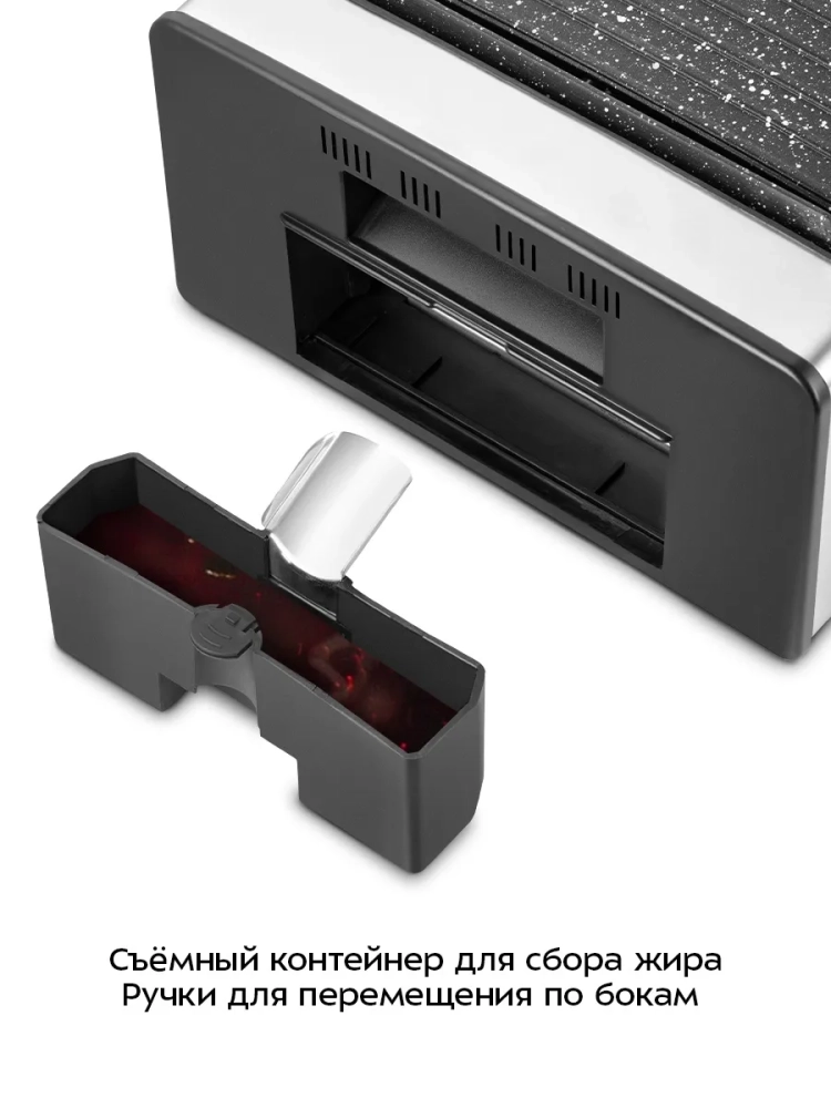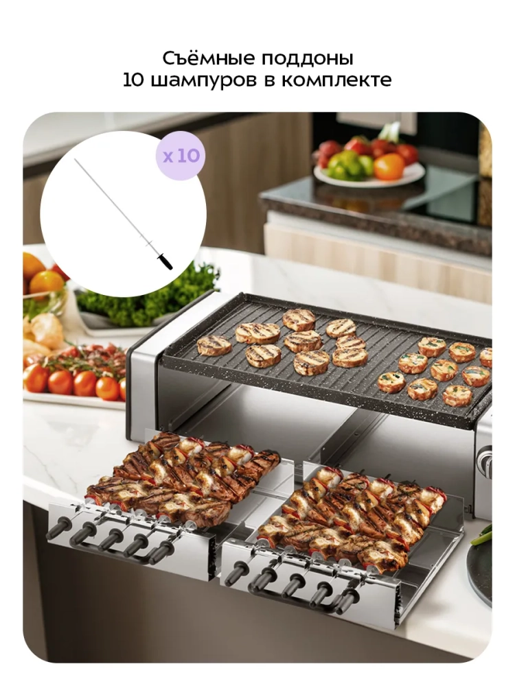 В комплект входят 10 шампуров, благодаря которым можно приготовить сразу несколько порций шашлыков или готовить одновременно разные блюда. Данная модель оснащена съемным контейнером для сбора жира и сока, которые выделяются в процессе приготовления. Специальные ручки по бокам устройства позволяют удобно перемещать его.