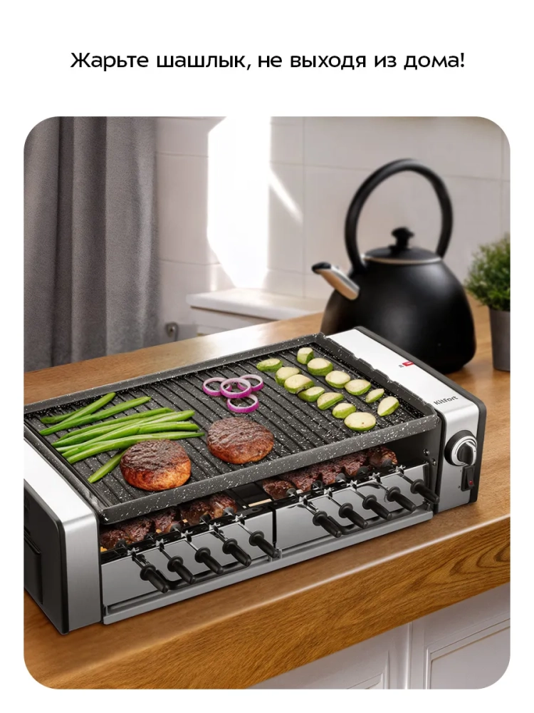 Электрогриль-шашлычница Kitfort КТ-4657 — это устройство, которое совмещает в себе сразу два прибора: гриль и шашлычницу. С его помощью можно приготовить мясо на гриле, мясной и овощной шашлык, люля-кебаб, сосиски, сардельки, бутерброды, панини, сэндвичи, гренки и другие блюда. Прибор прост в использовании. Он работает от сети электропитания, поэтому для приготовления блюд на гриле не нужно ставить мангал и разжигать угли, а в процессе готовки не будет сажи и копоти.