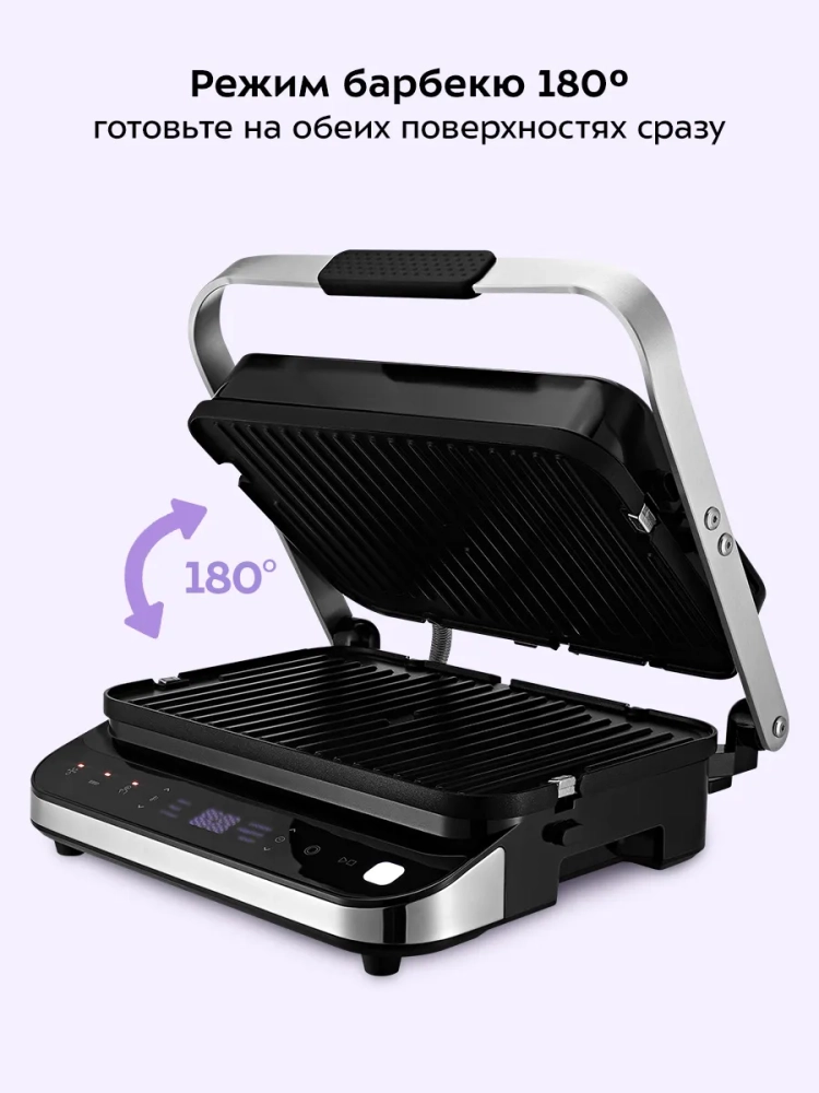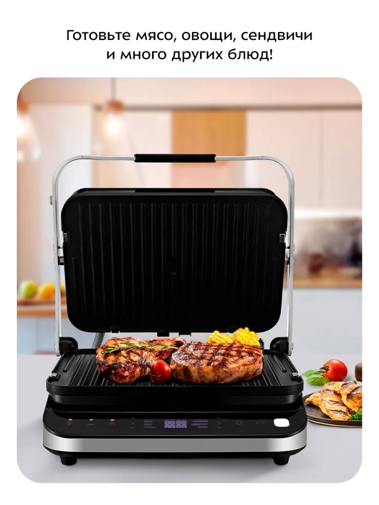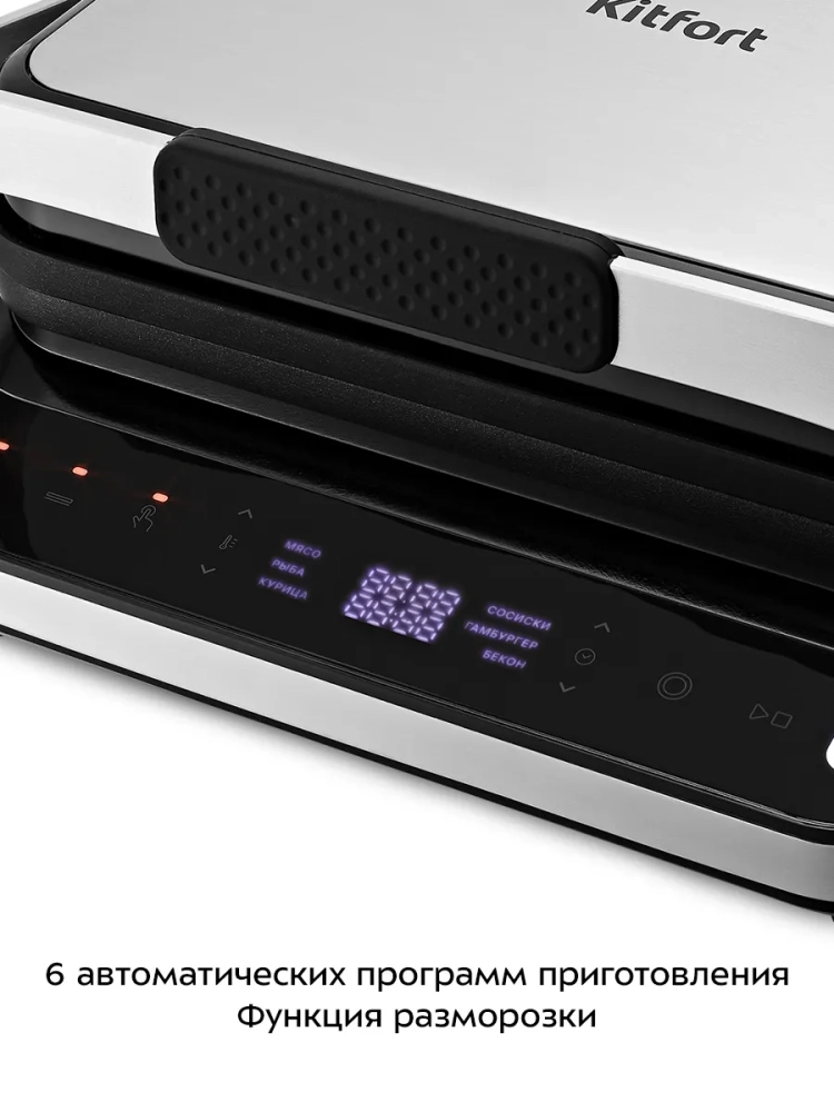 Электрогриль Kitfort КТ-1682 — это многофункциональный прибор, который станет незаменимым помощником на вашей кухне. Этот электрический гриль позволяет готовить разнообразные блюда: мясо, рыбу, овощи и даже бутерброды. Благодаря высокой температуре и ребристой поверхности панелей продукты приобретают аппетитный полосатый рисунок.