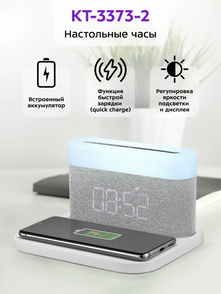 Настольные часы KT-3373 поддерживают быструю зарядку, если подключить шнур USB Type-C (комплектный или рассчитанный на ток не менее 2 А) к блоку питания, который поддерживает технологию QC 2.0 (Quick Charge, быстрая зарядка). При использовании блока питания без технологии QC2.0 выходная мощность беспроводной зарядки будет 5 Вт.