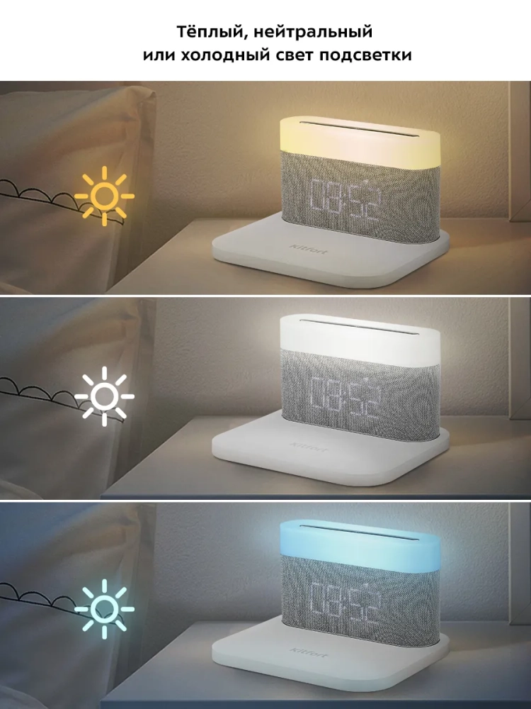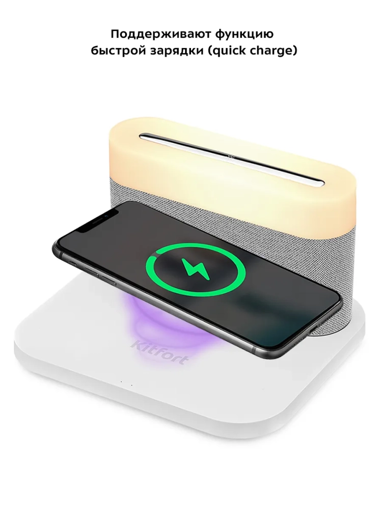 Настольные часы Kitfort KT-3373 состоят из настольных часов с подсветкой и беспроводной зарядки. Настольные часы выполняют сразу несколько функций: показывают время и дату, могут служить будильником и светильником. Благодаря беспроводной зарядке вы можете с легкостью заряжать телефон, часы или другие устройства, если они поддерживают функцию беспроводной зарядки. Устройство работает по стандарту Qi для индукционной передачи энергии. Многие современные смартфоны и умные часы поддерживают стандарт беспроводной зарядки Qi.
