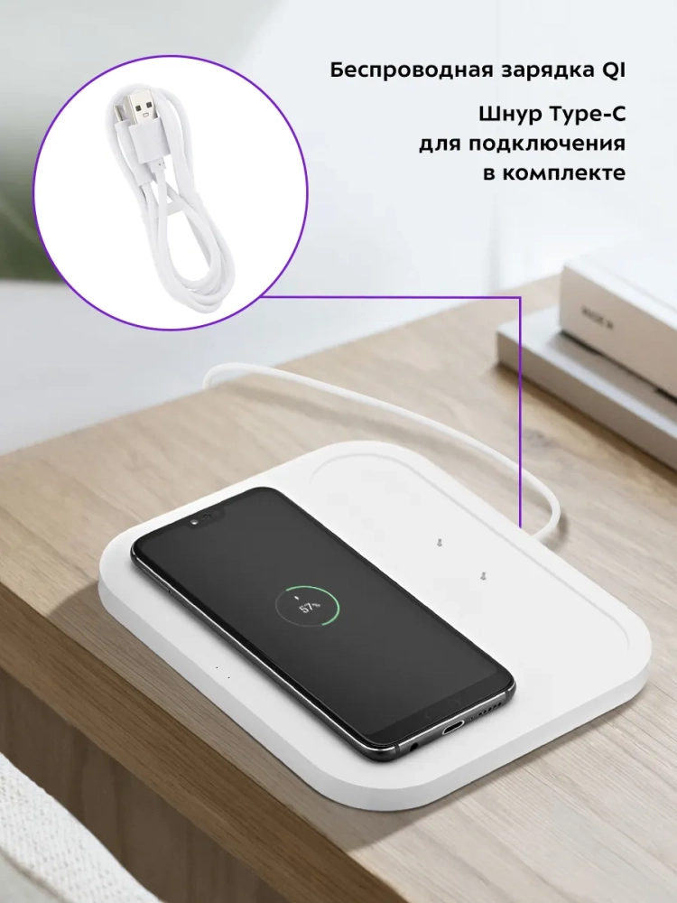 Беспроводная зарядка работает при подключении к источнику питания при помощи шнура USB Type-C. У настольных часов есть аккумулятор, поэтому вы можете перемещать их и использовать в любом удобном месте.
