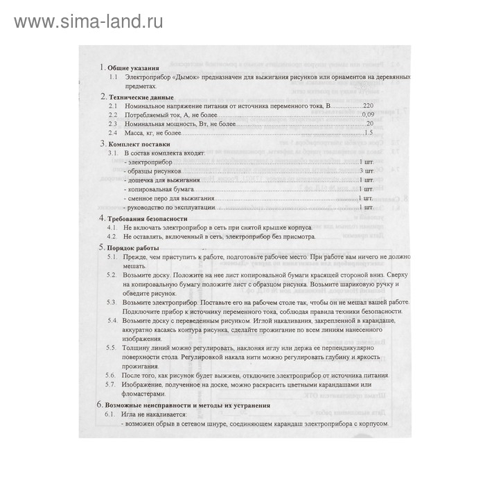 Электроприбор для выжигания по дереву «Дымок» 220 В, 20 Вт. в комплект входят образцы рисунков
