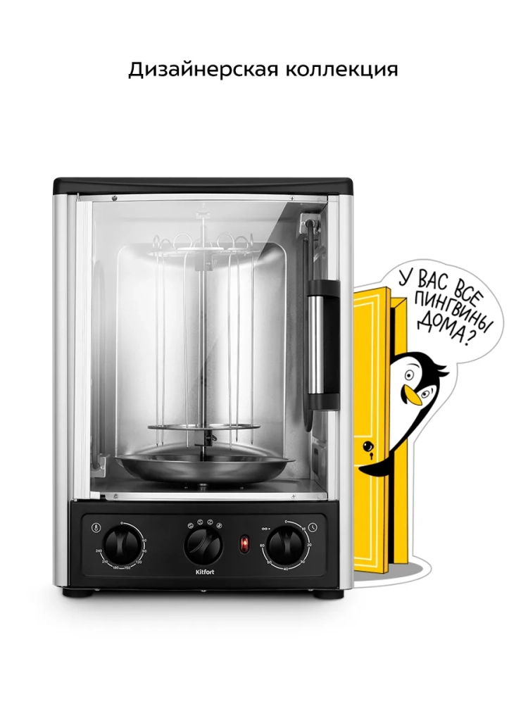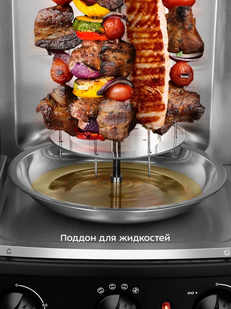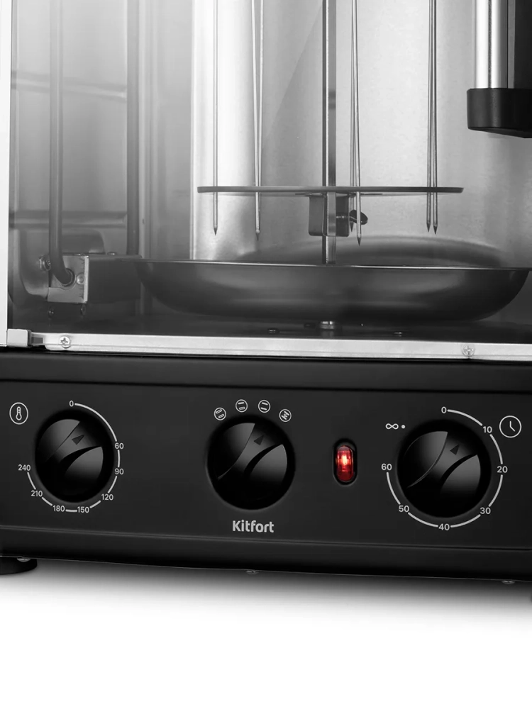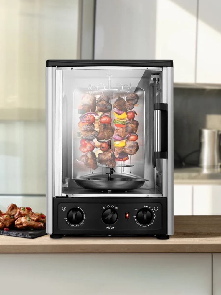 Электрошашлычница «2 в 1» Kitfort KT-1409 сочетает в себе функции двух устройств: электрошашлычницы и ростера. Вы можете приготовить шашлык из мяса, рыбы или овощей, а также шаверму (шаурму), сардельки, сосиски, картофель, курицу, гренки и другие блюда на вертеле или шампурах. С помощью противня и решеток в комплекте вы можете запекать продукты, используя прибор как ростер. Прибор прост и удобен в использовании. Он работает от обычной электрической розетки, не нужно ставить мангал и разжигать угли, нет сажи, дыма и копоти. Нужно лишь нанизать замаринованное мясо на шампуры и установить их в устройство. Электрошашлычница оснащена таймером до 60 минут, также вы можете выбрать приготовление без установки таймера. Температуру нагрева можно выбрать до 240 °С. Стеклянная дверь позволит вам следить за процессом приготовления и сохранить тепло во внутренней камере. Для запекания предусмотрено два режима работы. Режим «Верхний нагрев» служит для запекания небольшого количества продуктов или продуктов, не требующих сильного запекания. Режим «Верхний и нижний нагрев» подойдет для запекания больших продуктов и полноценного запекания блюда внутри. В режиме «Вертел» вертел автоматически вращается, поэтому во время приготовления происходит чередование процесса нагрева и охлаждения, тем самым образуется изумительный вкус и мясо равномерно обжаривается со всех сторон. Стоит отметить полезность блюд, приготовленных в электрошашлычнице. Многие слышали, что продукты, приготовленные на мангале, сложно отнести к полезным. Виной тому — тот самый дым, который хоть и придает мясу неповторимый привкус, но является вредным. В электрошашлычнице блюдо готовится быстро и получается более полезным. Благодаря вертикальной конструкции электрошашлычница очень компактна и не занимает много места. Под вертел устанавливается поддон для жидкости, куда стекает жир и излишки влаги от продуктов. После приготовления поддон можно легко снять и очистить.