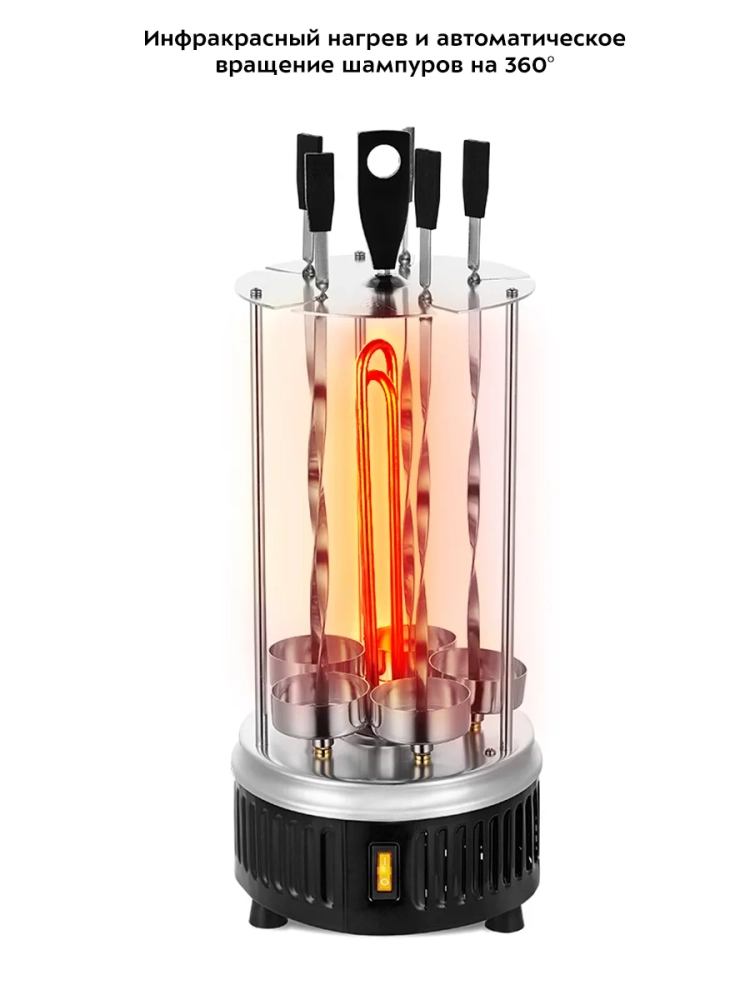 Шашлычница КТ-1406 проста и удобна в использовании. Она работает от обычной электрической розетки, не нужно ставить мангал и разжигать угли, нет никакой сажи, дыма и копоти! Все что требуется, это замариновать мясо, нанизать его на шампуры и установить их вокруг нагревательного элемента. Инфракрасный нагревательный элемент обеспечивает такой же нагрев, какой дают угли в обычном мангале, а шампуры автоматически вращаются, поэтому во время приготовления происходит чередование процесса нагрева и охлаждения, что создает в мясе постоянный поток тепла и внутренних соков, тем самым образуется изумительный вкус и мясо равномерно обжаривается со всех сторон.