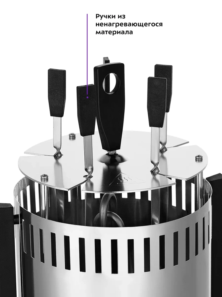 Благодаря вертикальной конструкции электрошашлычница очень компактна и не занимает много места. Под каждым шампуром расположена специальная тарелочка, куда стекает жир. После приготовления эти тарелочки можно снять и легко вымыть, слив жир. Кожух шашлычницы легко снимать и устанавливать. Шампуры оснащены удобными ручками из ненагревающегося материала, поэтому их можно брать руками, не обжигаясь.