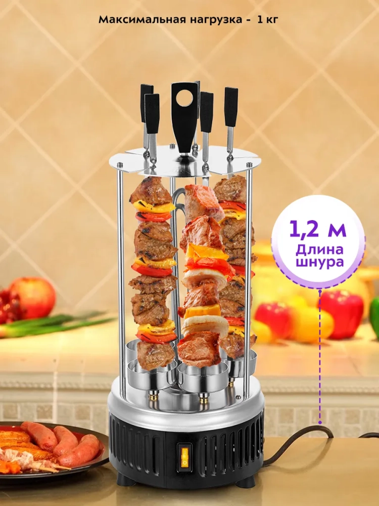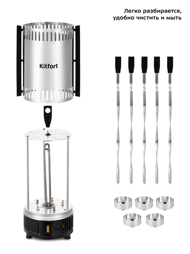 Электрошашлычница Китфорт КТ-1406 предназначена для приготовления шашлыка из мяса, рыбы или овощей, а также для приготовления шавермы, сарделек, сосисок, картошки и других блюд.