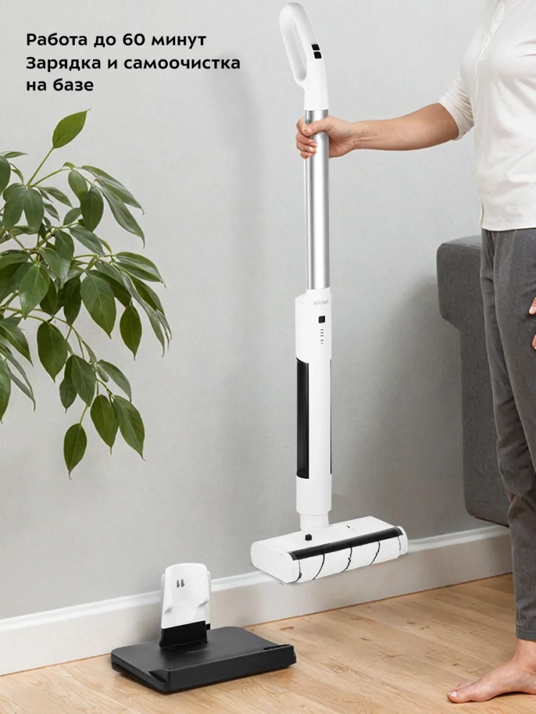 Для зарядки и автоматической очистки прибор устанавливается на базу. Электрошвабра работает от аккумулятора, который обеспечивает время работы до 60 минут.