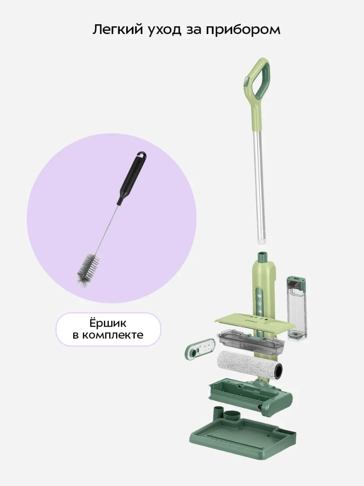 Прибор оснащен функцией самоочистки, что очень удобно и экономит время. Резервуары для чистой и грязной воды и валик турбощетки легко снимаются и очищаются. В комплекте есть мерный стакан для удобного заполнения резервуара для чистой воды и ершик для чистки.