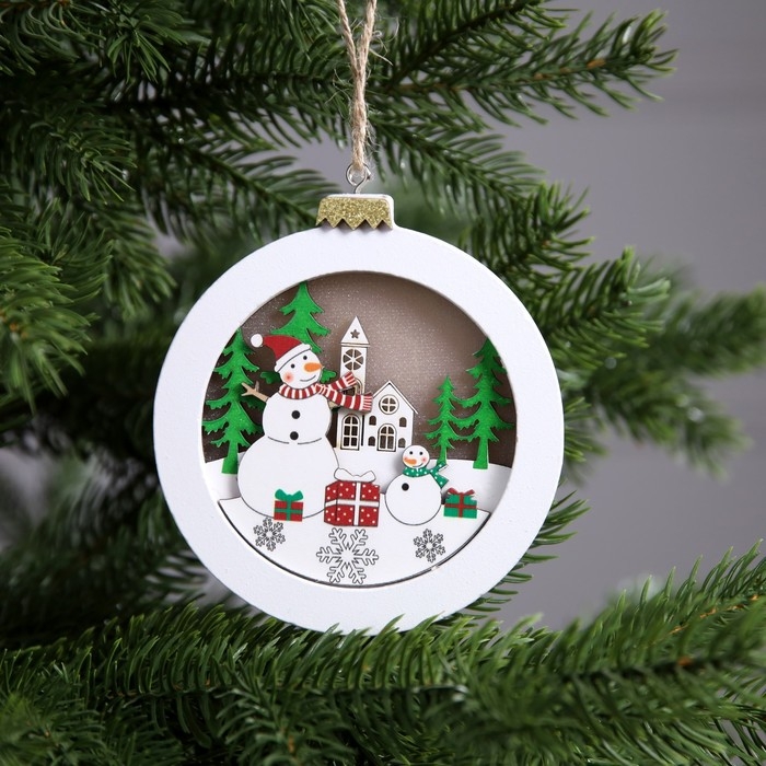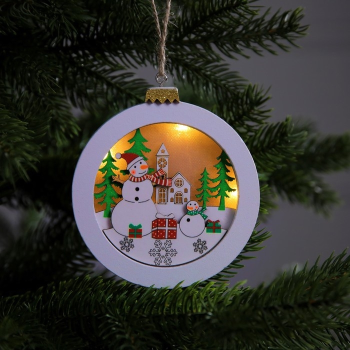 Ёлочная игрушка «Снеговики в лесу», от батареек, свечение тёплое белое