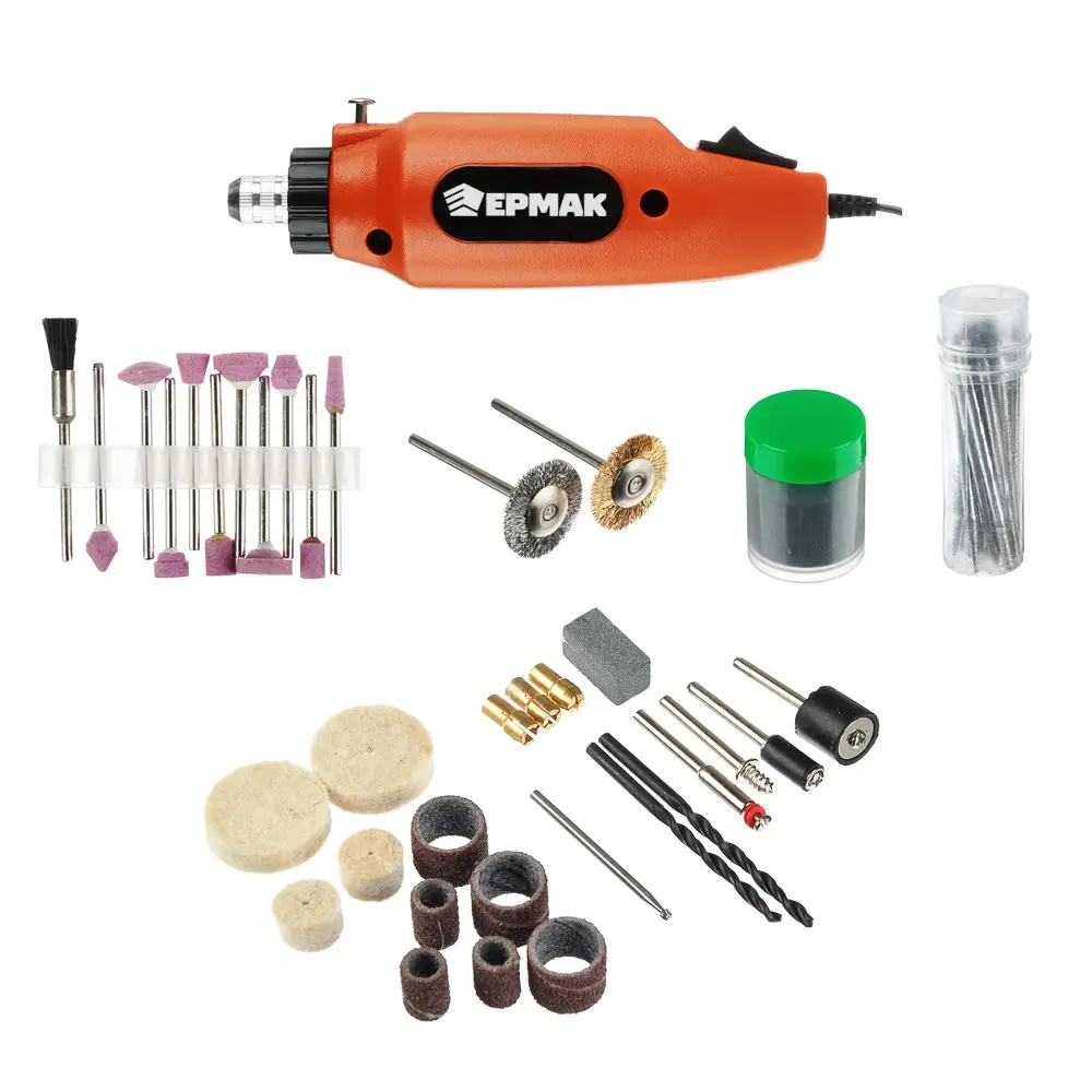 - Мини-дрель; Адаптер питания; Инструкция; Держатель для отрезных кругов - 1 шт.; Круги отрезные - 25 шт.; Держатель для полировальных кругов - 1 шт.; Круги полировальные - 4 шт.; Держатель для наждачных трубок - 2 шт.; Трубки наждачные - 4 шт.; Сверла - 4 шт.; Цанги - 4 шт.; Насадка-щетка нейлоновая - 1 шт.; Насадка-щетка проволочная - 2 шт.; Брусок заточной -1 шт.; Насадка со шлифовальным камнем из оксида алюминия - 10 шт.; Бур алмазный - 20 шт.; Бур карбидный - 1 шт.
