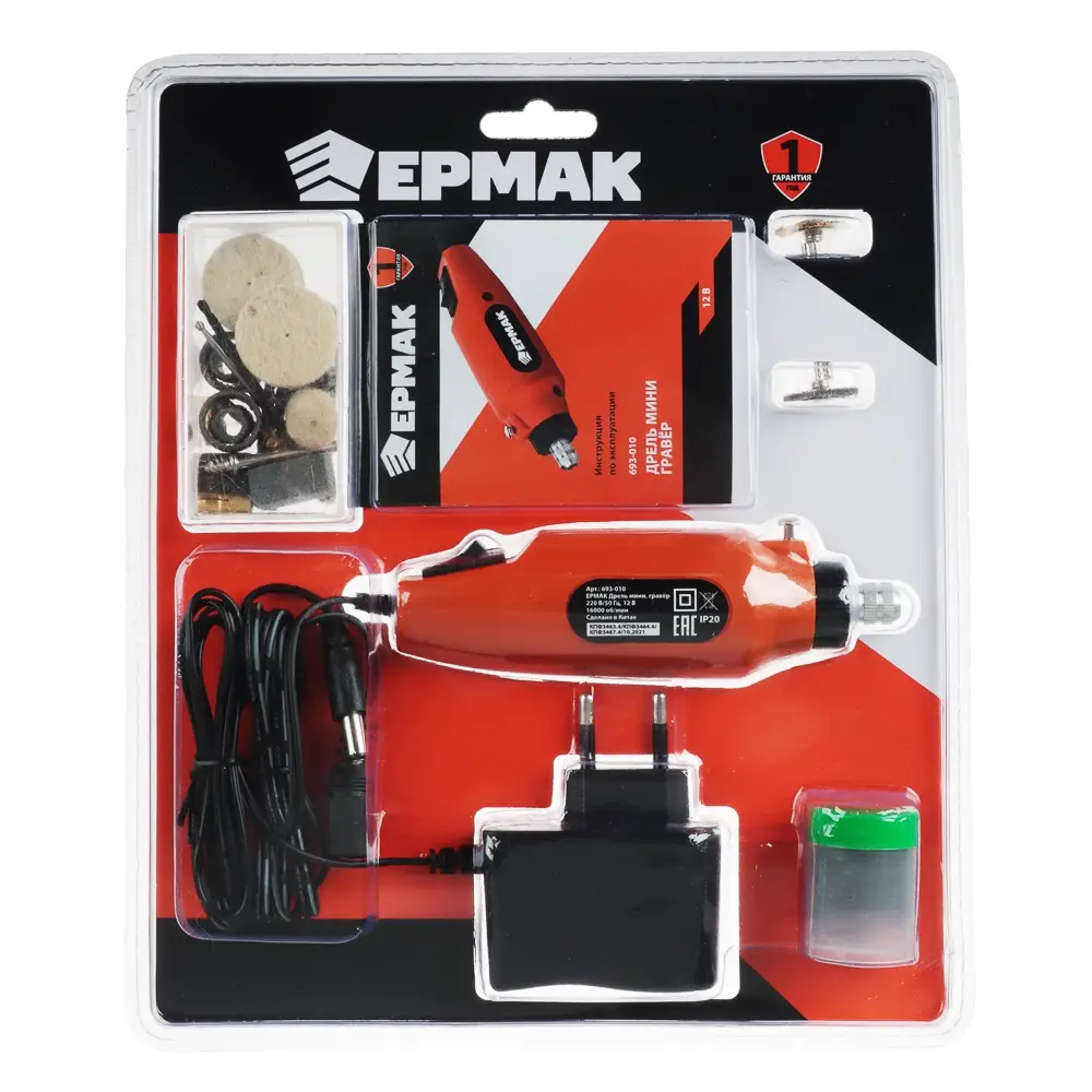 Дрель ЕРМАК мини на блистере с подвесом необходимый комплект для ремонтно-отделочных работ. Включает 80 предметов и используется для тонких работ: нанесения гравировки, финишной шлифовки, сглаживания острых граней или заусенцев, сверления небольших отверстий. Мощностью 16000 об