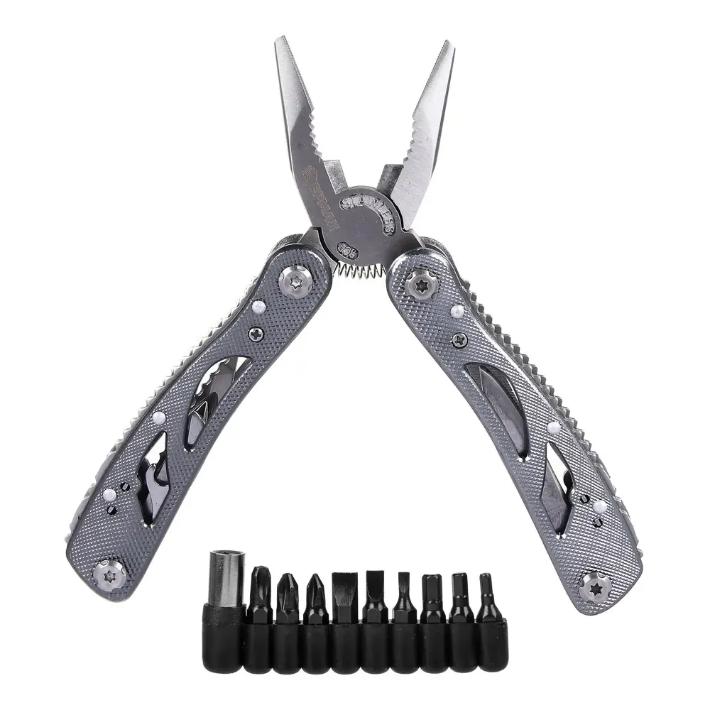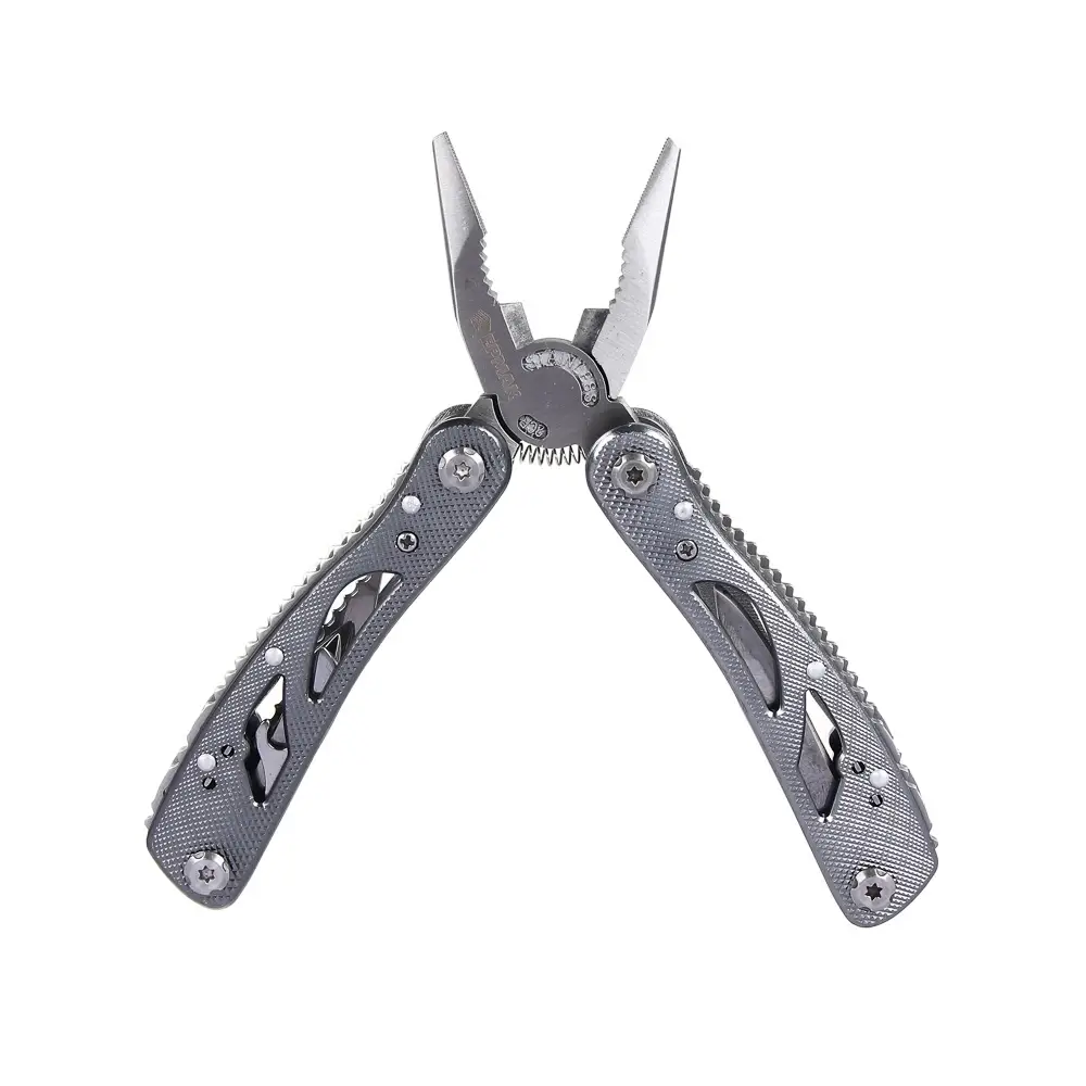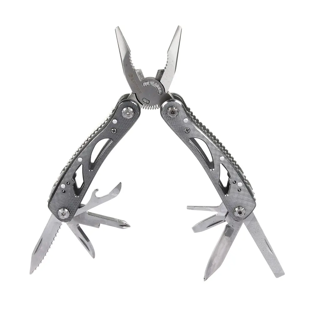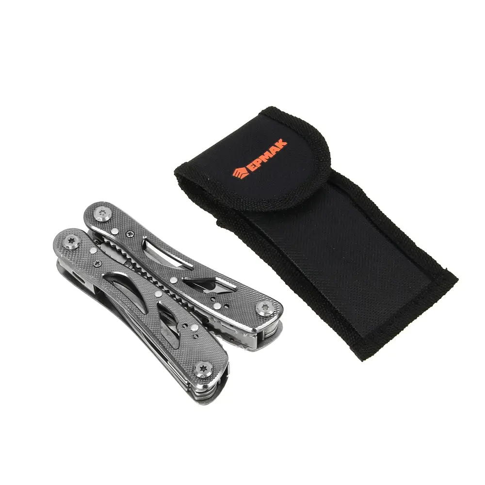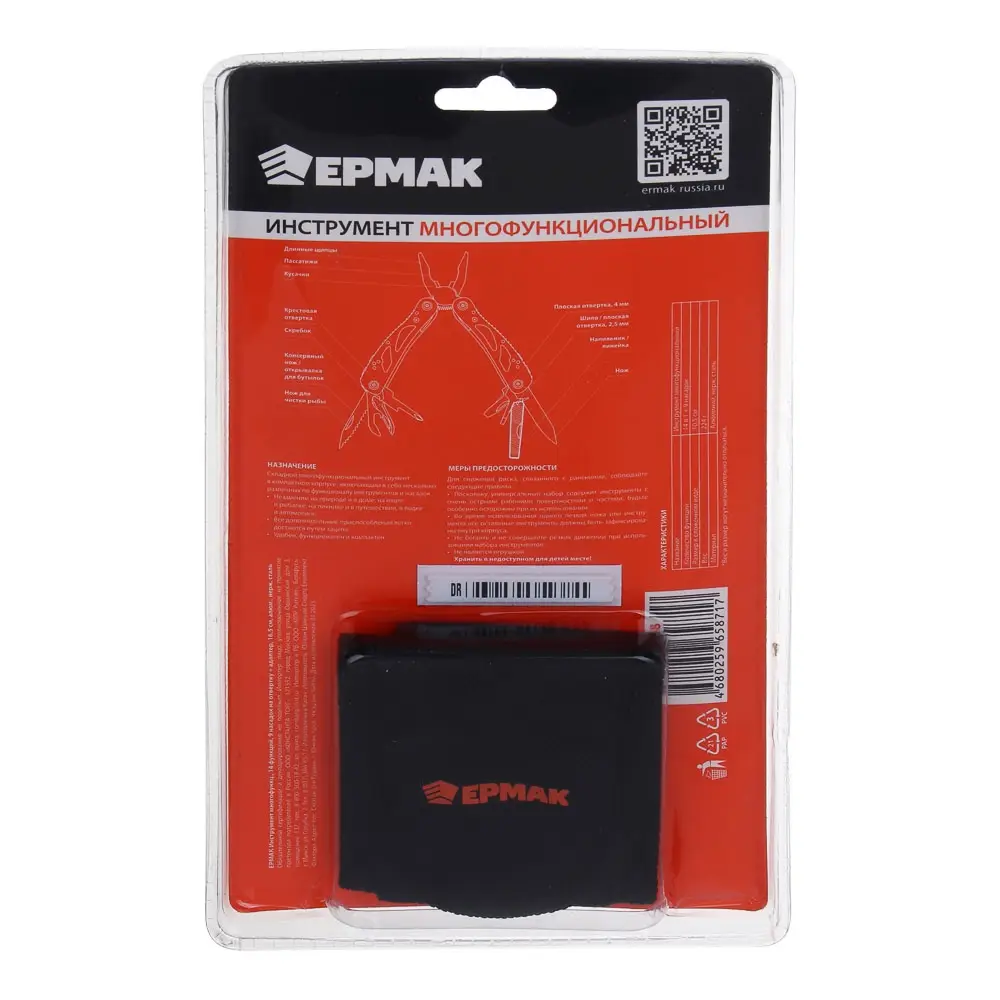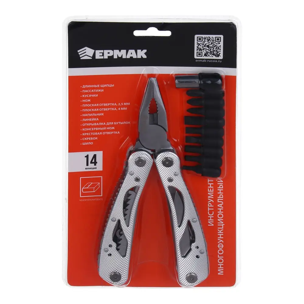 Многофункциональный инструмент ЕРМАК – необходимая вещь в доме, в походе или в машине. Инструмент придет на помощь, когда необходимо устранить поломку или неисправность. 11 в одном: длинные щипцы, пассатижи, кусачки, нож, две плоские отвертки и одна крестообразная + 9 насадок, линейка/пилочка, консервный нож, зазубренное лезвие ножа, скребок. В комплекте имеется чехол для хранения.