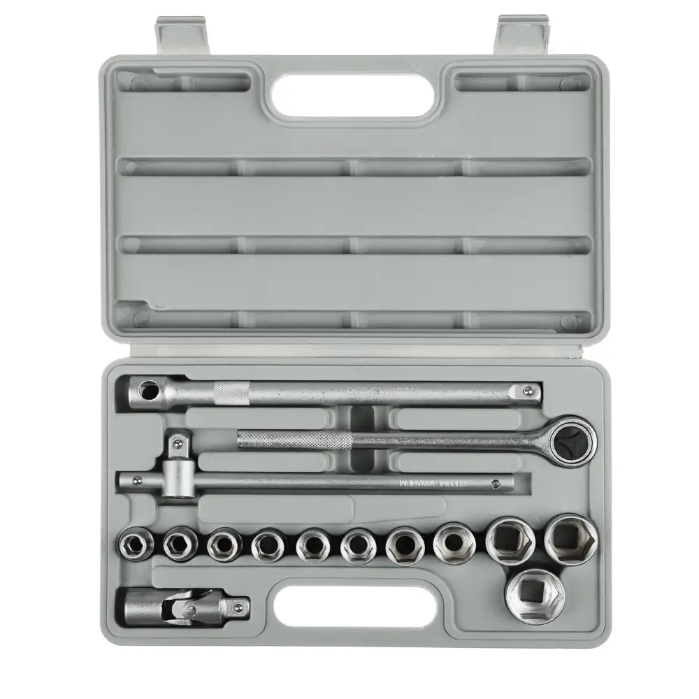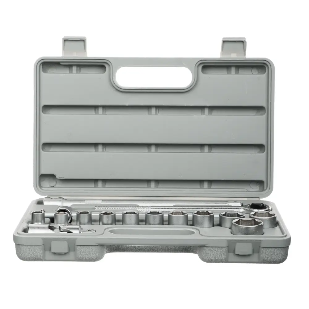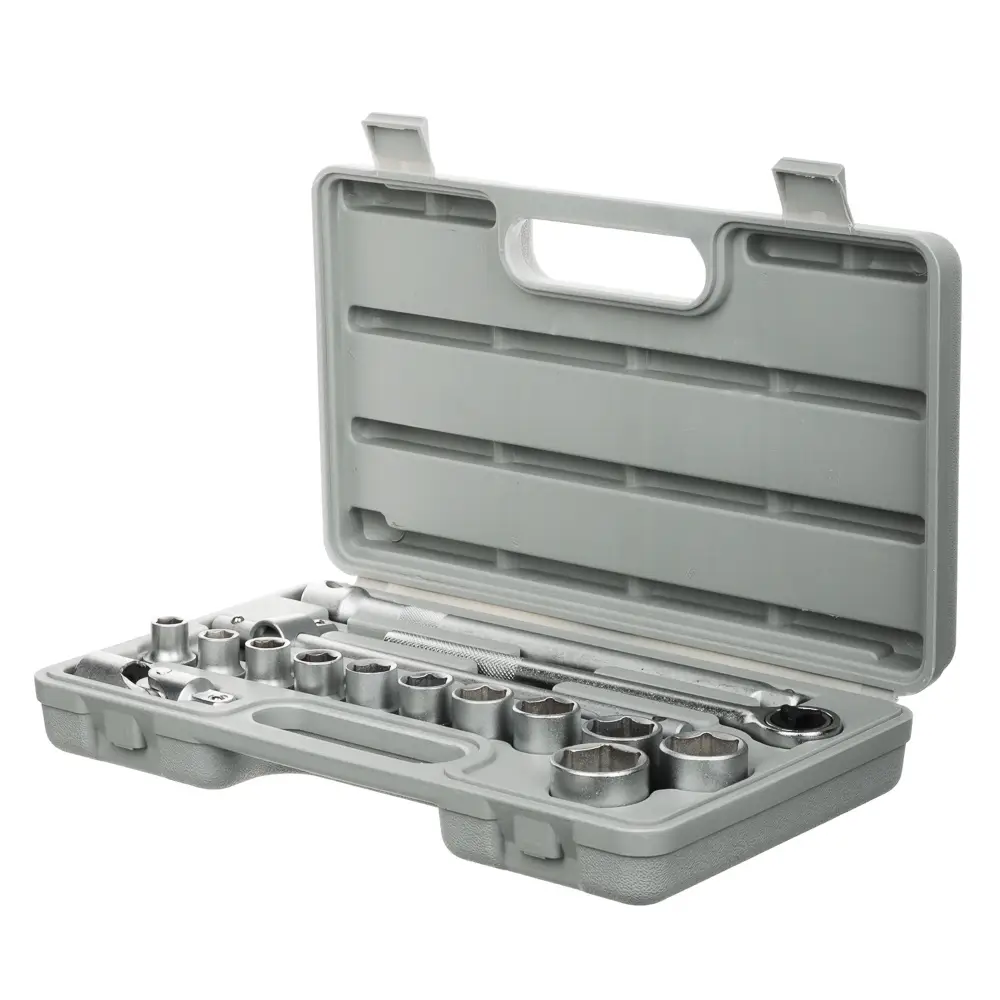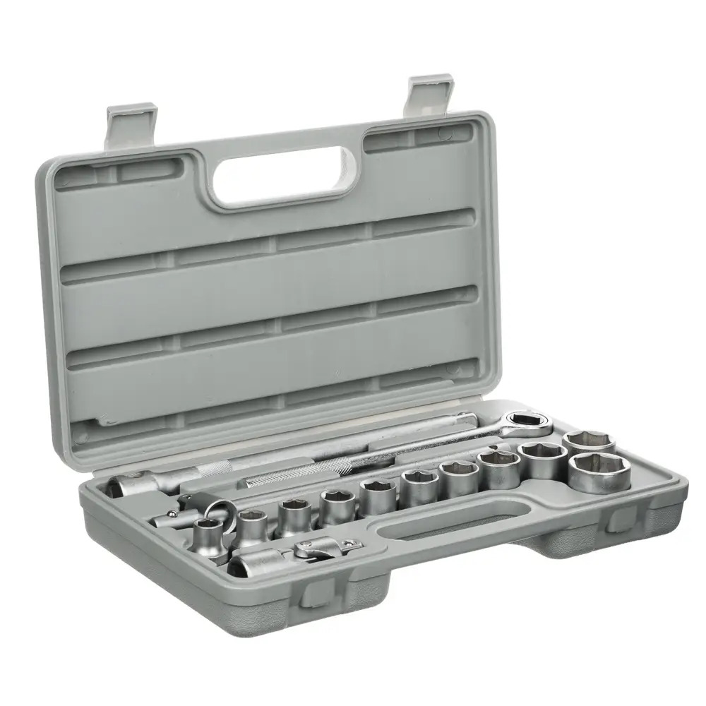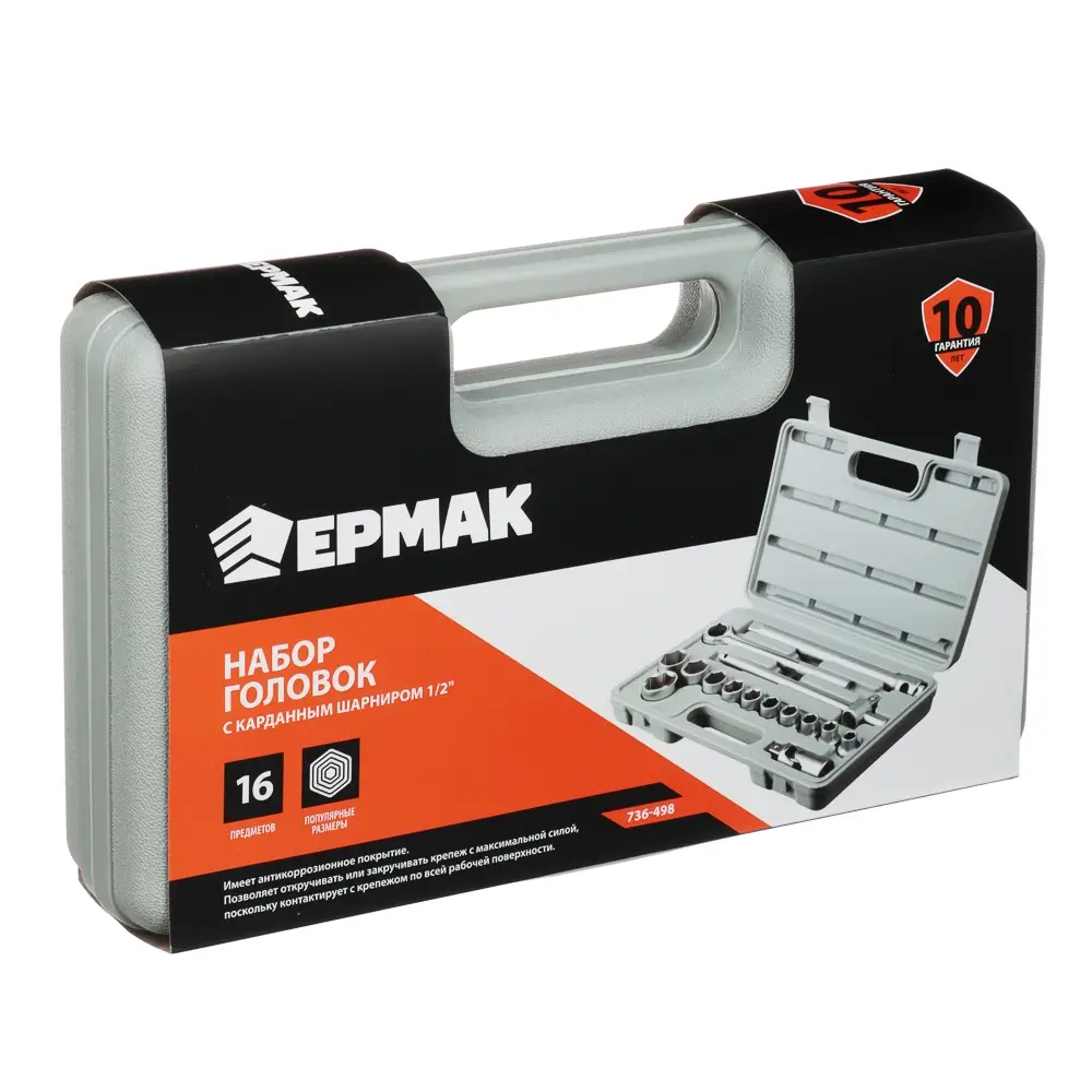 Набор головок ЕРМАК — базовый комплект с самыми популярными размерами торцевых головок и вспомогательными инструментами для закручивания и откручивания гаек, болтов, винтов и прочих крепежных элементов. Благодаря прочному пластиковому кейсу набор легко транспортировать и удобно хранить. В комплект входит 16 предметов: головки торцевые 1/2" 10, 11, 12, 13, 14, 15, 17, 19, 22, 24, 27 мм (11 шт.); ключ трещоточный для головок 1/2"; удлинитель 1/2" 200 мм; вороток Т-образный 1/2"; карданный шарнир 1/2".