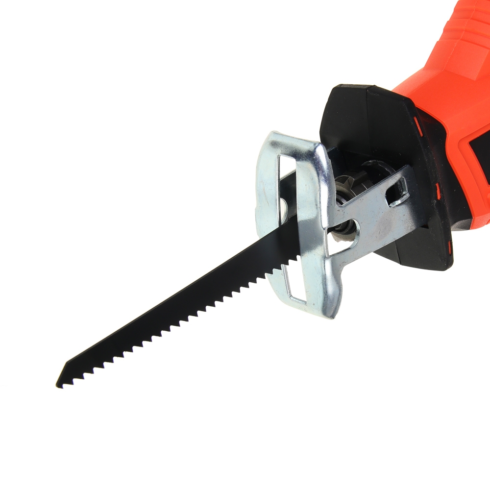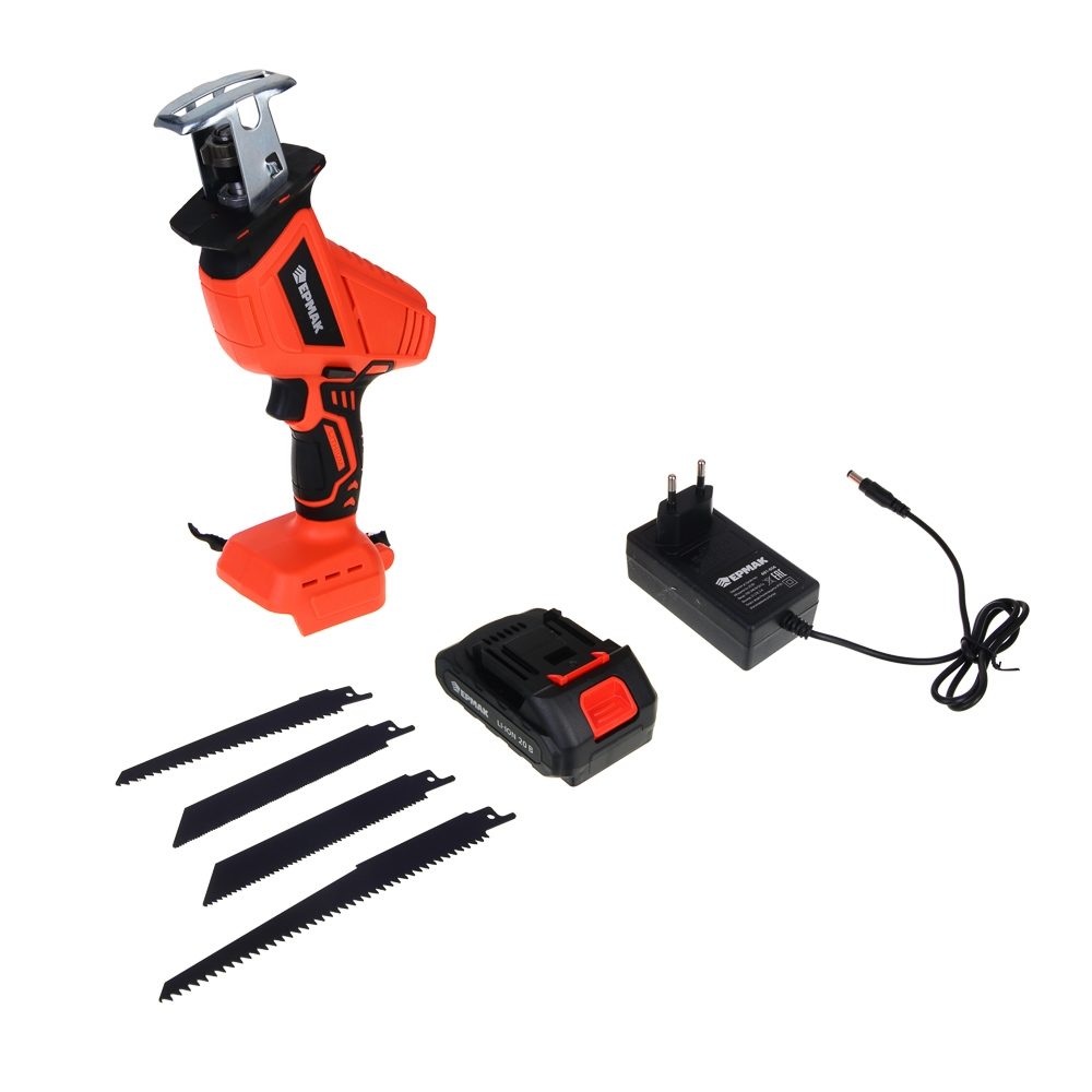 Сабельная аккумуляторная пила ЕРМАК — мощный и надёжный инструмент для резки различных материалов. Работает от аккумулятора напряжением 20 В и ёмкостью 2 А*ч. Скорость холостого хода составляет 3000 ход/мин, а величина хода — 15 мм. Пила выполнена из пластика и металла, оснащена литий-ионным аккумулятором типа Li-lon.