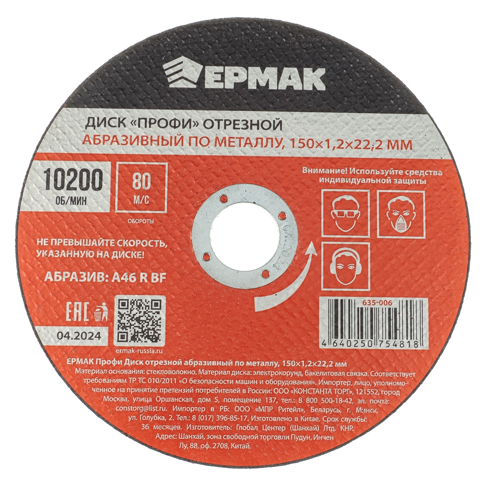 Отрезной абразивный диск по металлу ЕРМАК «Профи» размером 150x1,2x22,2 мм предназначен для резки различных металлов, включая нержавейку. Справляется с металлическими изделиями достаточно большой толщины. Максимальное количество оборотов при использовании совместно с УШМ – 10200 об/мин (80 м/с). Абразив A46 R BF имеет хороший запас прочности и износостойкости.
