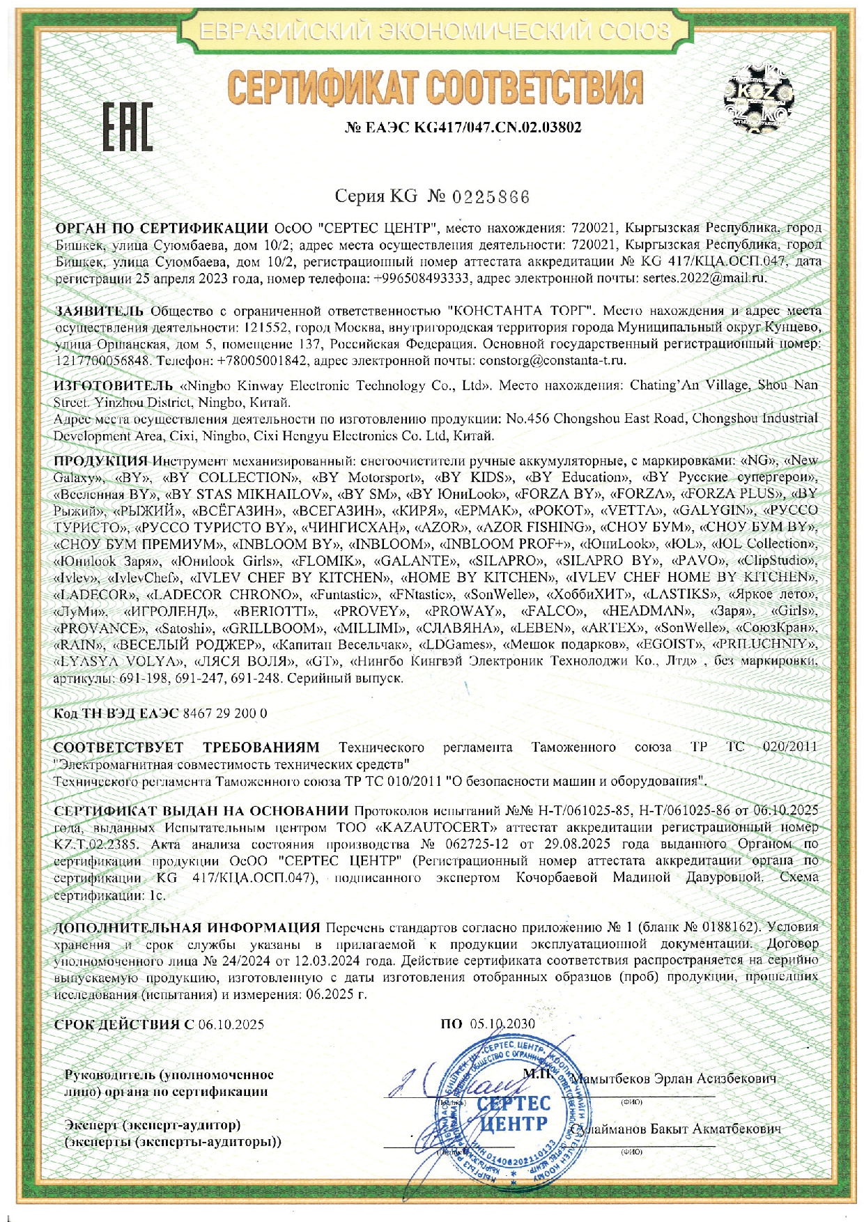 - Снегоуборщик - 1 шт.; Зарядное устройство - 1 шт.; АКБ - 1 шт.