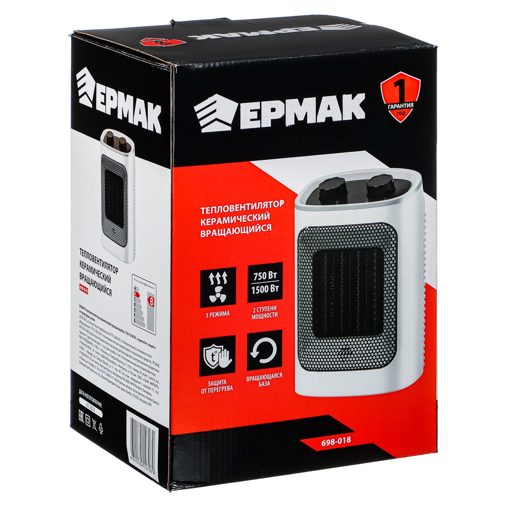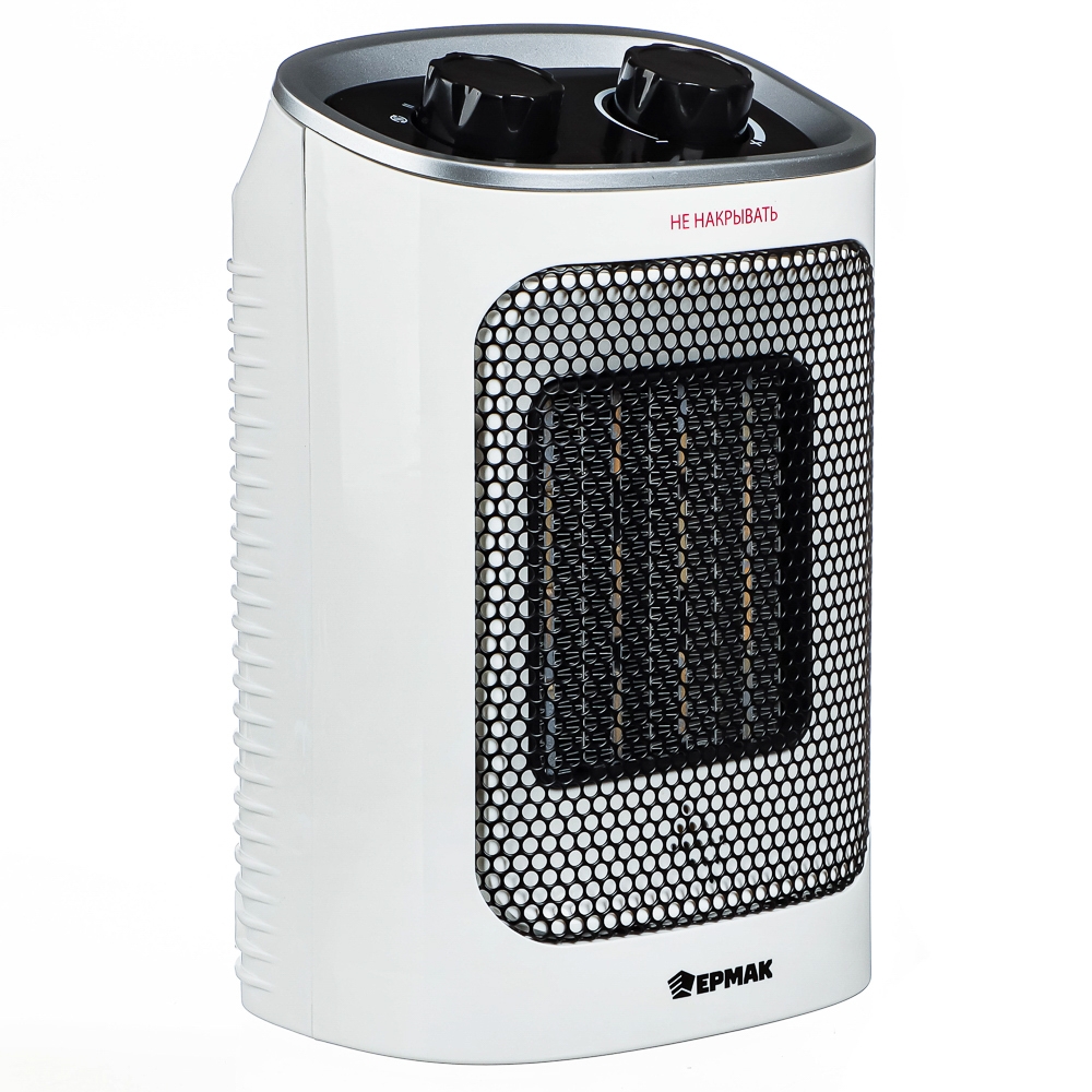 ЕРМАК Тепловентилятор керамический вращающийся 750/1500Вт, термостат, защита от перегрева, ручка