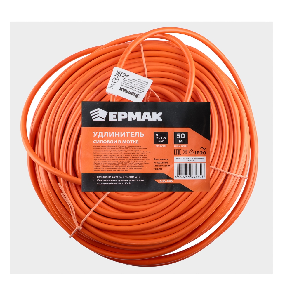 ЕРМАК Удлинитель силовой в мотке, 2х1,5 мм2, длина 50м (макс.нагрузка 16А или 2,2кВт)