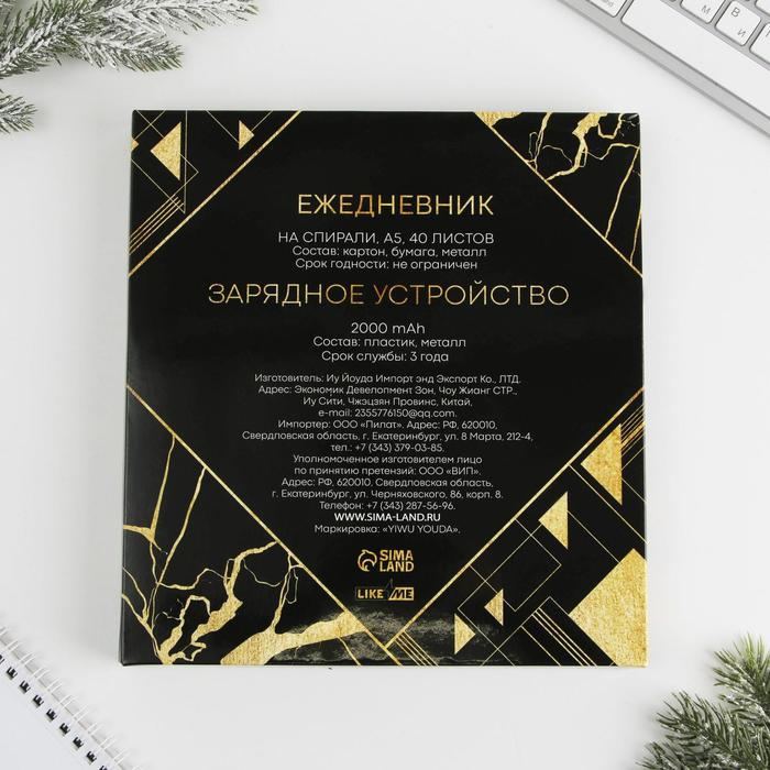 В набор входит ежедневник на спирали формата А5 (40 листов) и зарядное устройство 2000 mAh. В комплекте к внешнему аккумулятору идёт отдельный шнур для разъема USB и micro USB. Подходит для пополнения заряда аккумулятора мобильных телефонов, планшетов, MP3-плееров, цифровых фотокамер и других устройств.
